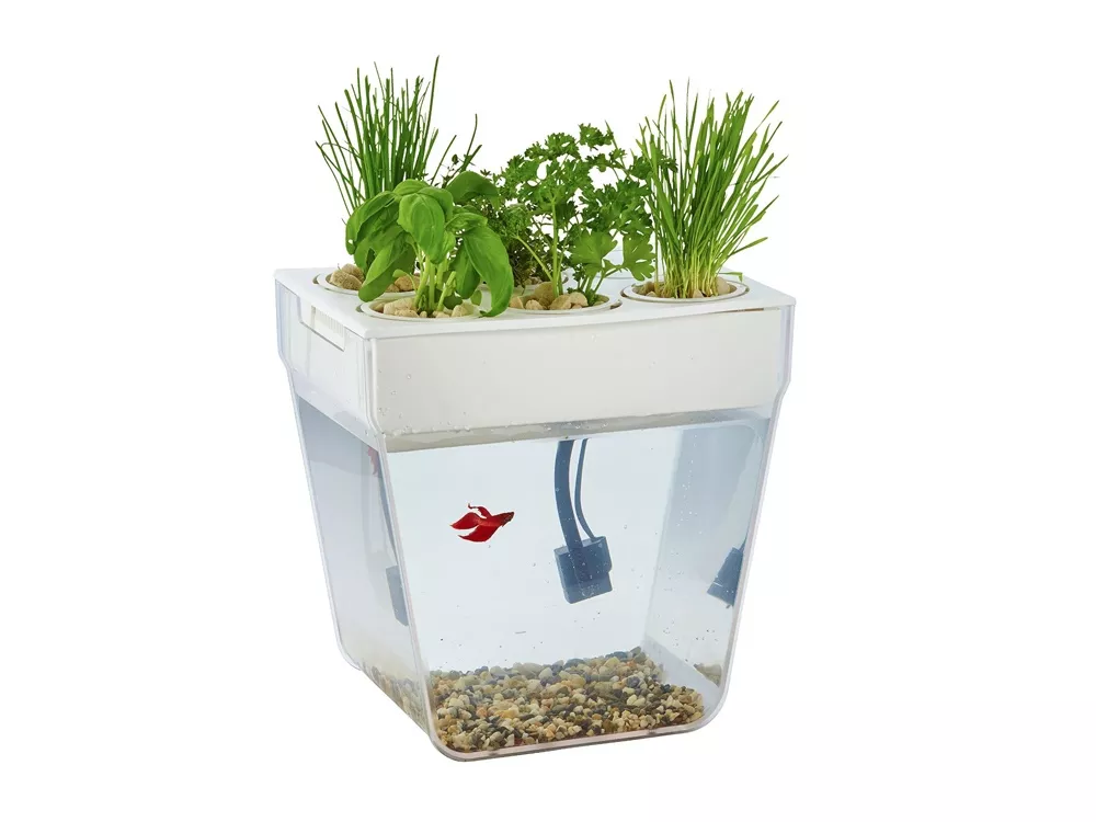 По сути — это замкнутая экосистема, поддерживающая баланс между растениями и рыбкой. Её отходы с помощью насоса поднимаются к горшочкам сверху и питают вашу маленькую плантацию. Взамен рыбка получает очищенную воду, а у любого городского жителя всегда есть в наличии свежая зелень к столу.