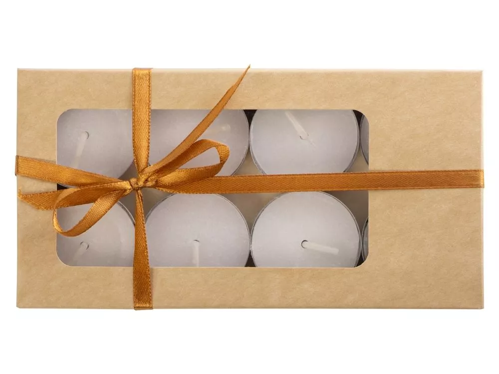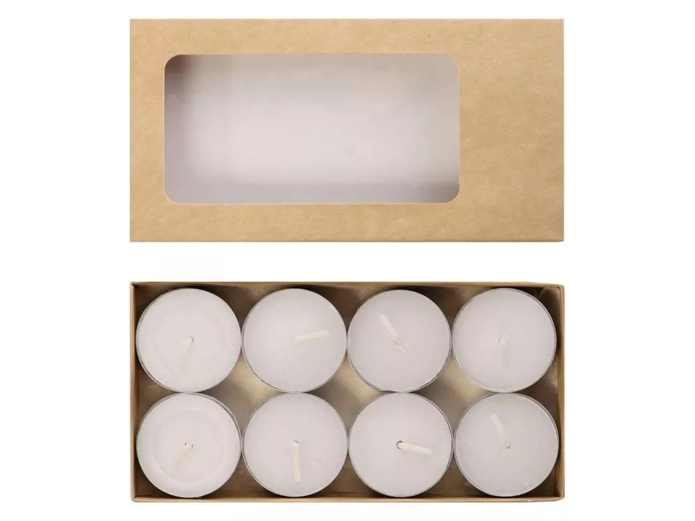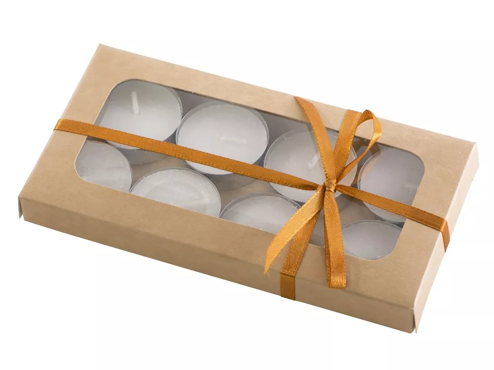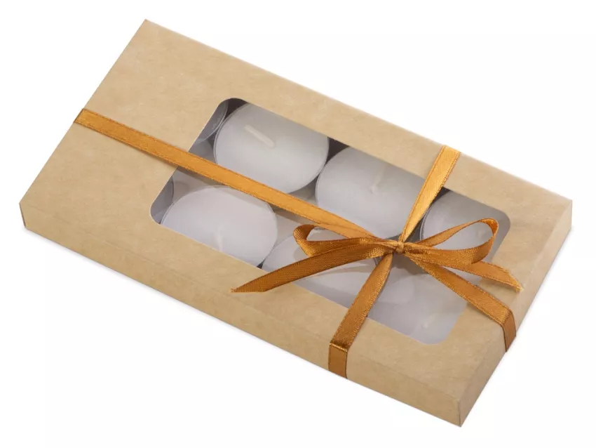 Свечи выполнены из белого воска без запаха, упакованы в крафтовую коробку с прозрачным окошком и перевязаны шелковистой ленточкой. В каждой коробке — 8 свечей.