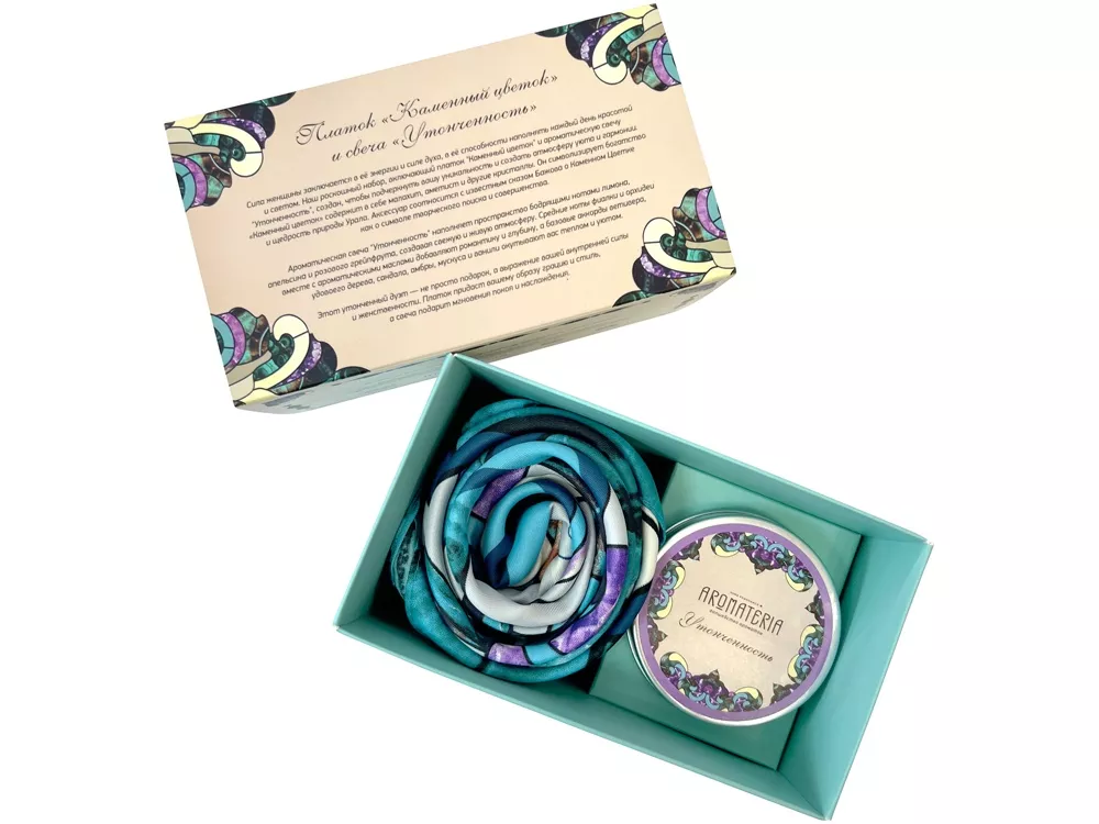 Платок Каменный цветок открывает сокровищницу садов Хозяйки Медной горы. Заглавный образ навеян сказом о Каменном Цветке – символе творческого поиска и совершенства. Мозаика цветка содержит уральские самоцветные кристаллы аметиста и медного изумруда в обрамлении каймы узорчатого малахита.