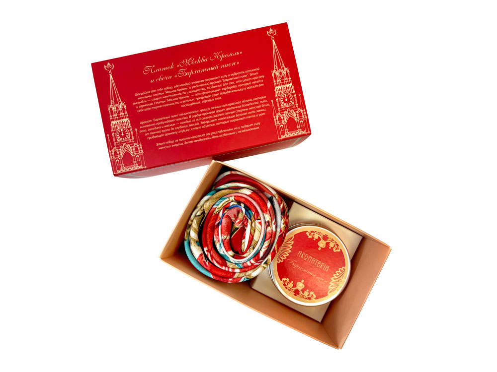 Платок Кремль – Москва в шелке воплощает шедевр ювелирного искусства Карла Фаберже из серии подарков для русской императорской семьи. В центре полотна расположен Успенский собор в обрамлении башен Московского Кремля. Утонченный рисунок, яркое цветовое решение и глубокий символизм дизайна платка созданы для эффектного акцента праздничного образа.