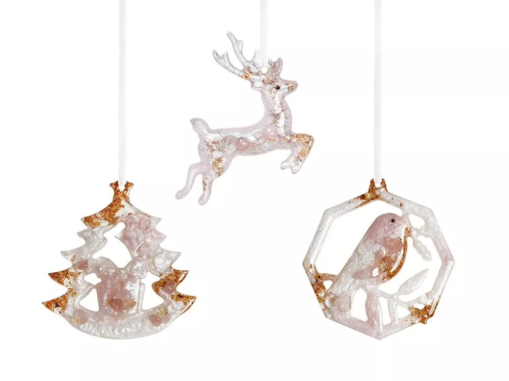 Игрушки бережно упакованы в картонную коробку с внутренним вкладышем, который надежно фиксирует их внутри. Для вашего удобства к каждой игрушке прилагается элегантная ленточка, с помощью которой вы легко сможете подвесить их на ёлку.