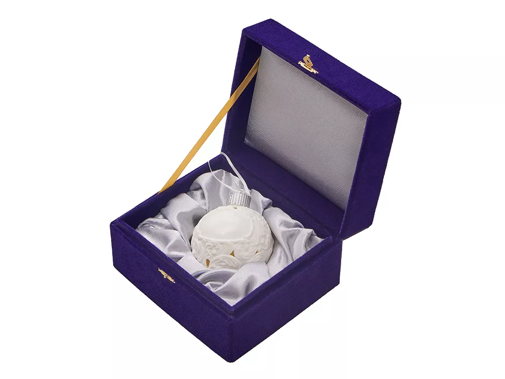 Игрушка упакована в изысканный подарочный футляр, обитый синим бархатом, что подчеркивает её ценность и делает готовым презентом для коллег и партнеров.