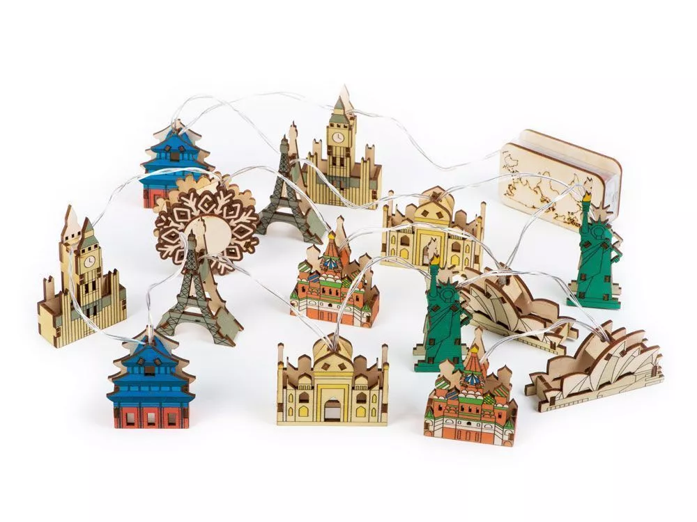 Гирлянда состоит из 14 парных фигурок достопримечательностей и центрального элемента в виде снежинки.