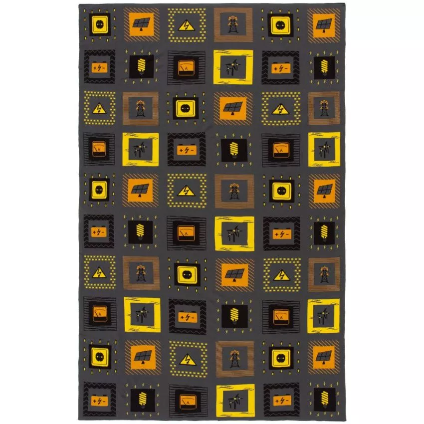 В каждой части общего рисунка, напоминающего лоскутное шитье, в самых теплых красках изображены главные символы электроэнергетики.