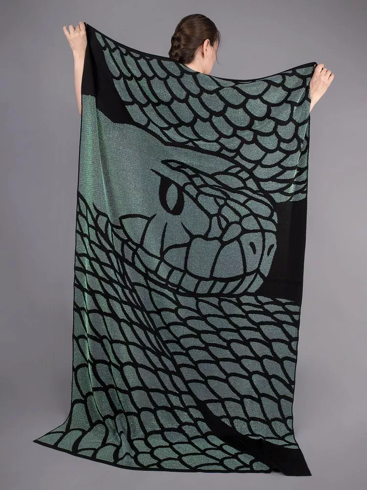 Змейка на пледе довольно изящна и загадочна: к ее гладкой и блестящей, словно магической, чешуе так и хочется прикоснуться. Сам плед кажется воздушным и слегка полупрозрачным: узор связан с добавлением люрекса жемчужного оттенка, что выигрышно выделяет элементы и добавляет всему изделию притягательности и блеска.