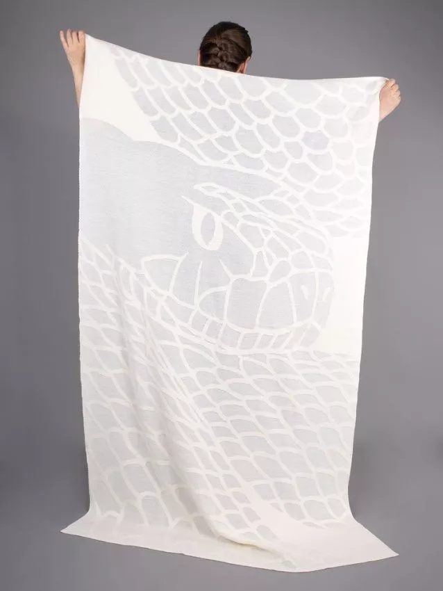 Змейка на пледе довольно изящна и загадочна: к ее гладкой и блестящей, словно магической, чешуе так и хочется прикоснуться. Сам плед кажется воздушным и слегка полупрозрачным: узор связан с добавлением люрекса жемчужного оттенка, что выигрышно выделяет элементы и добавляет всему изделию притягательности и блеска.