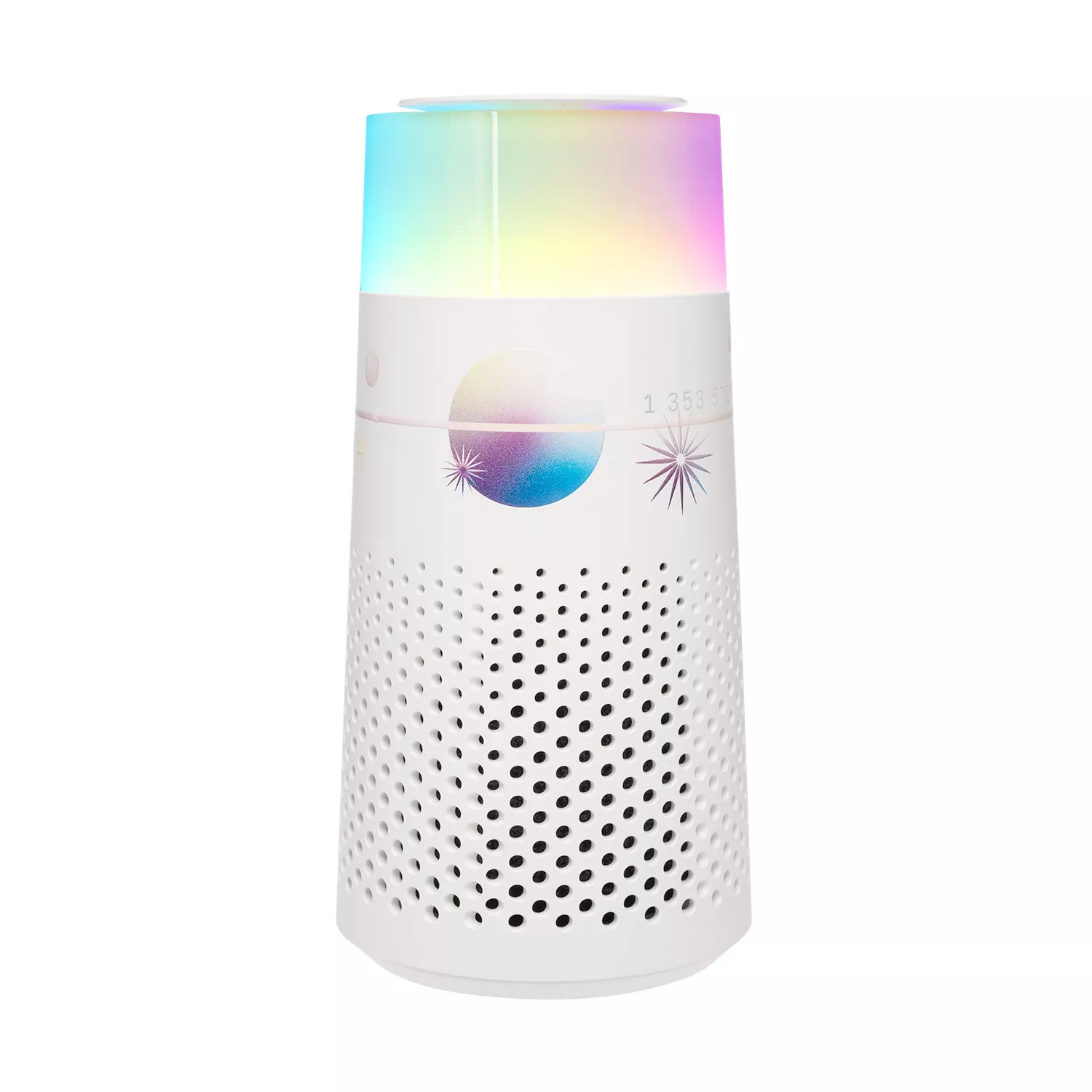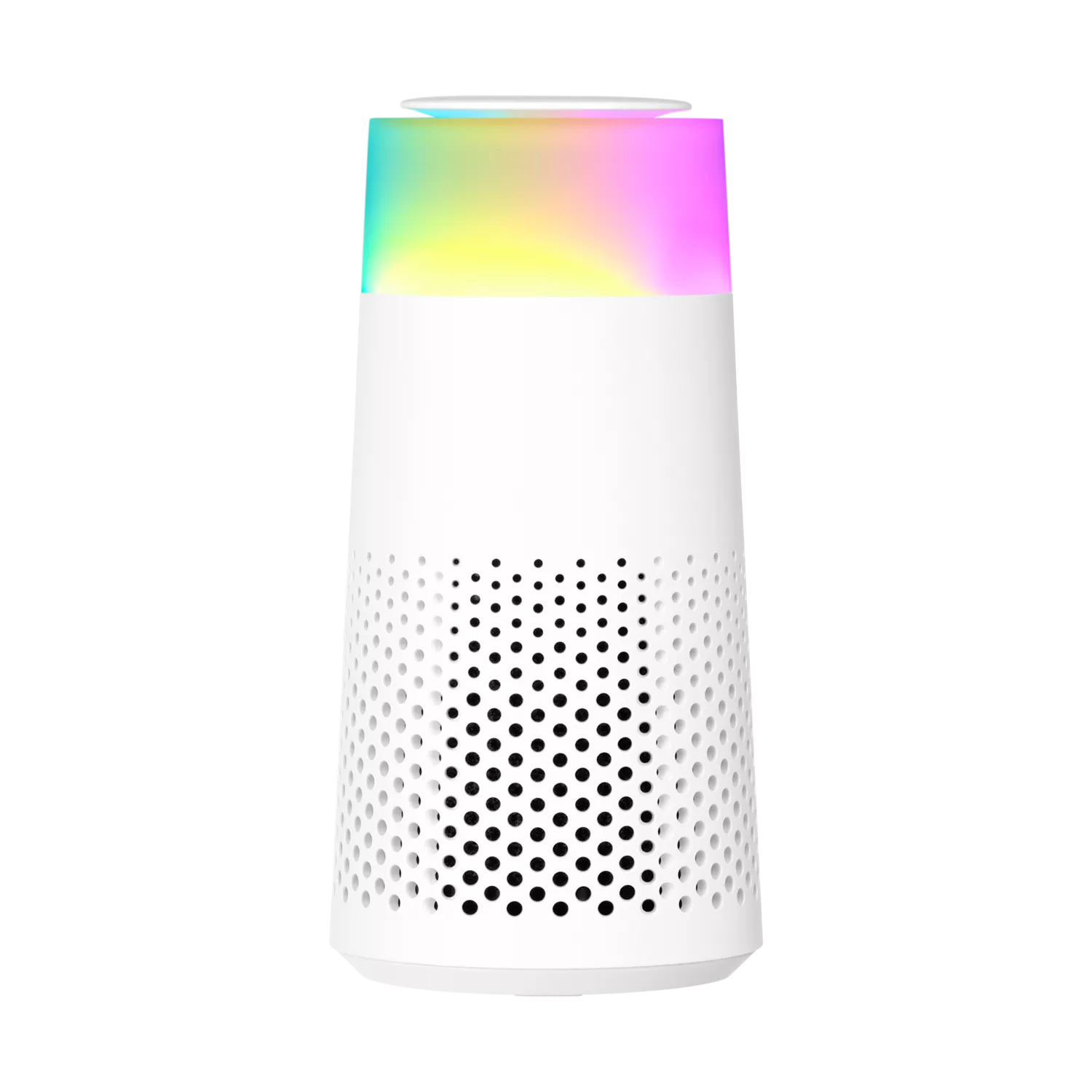 Мини-очиститель воздуха с радужной LED-подсветкой. Высококачественный фильтр с тройной системой фильтрации в сочетании с высокоскоростным вентилятором очищают воздух, поглощая и фильтруя различные загрязнители через гладкую аэродинамическую трубу. Освежение воздуха за несколько минут.