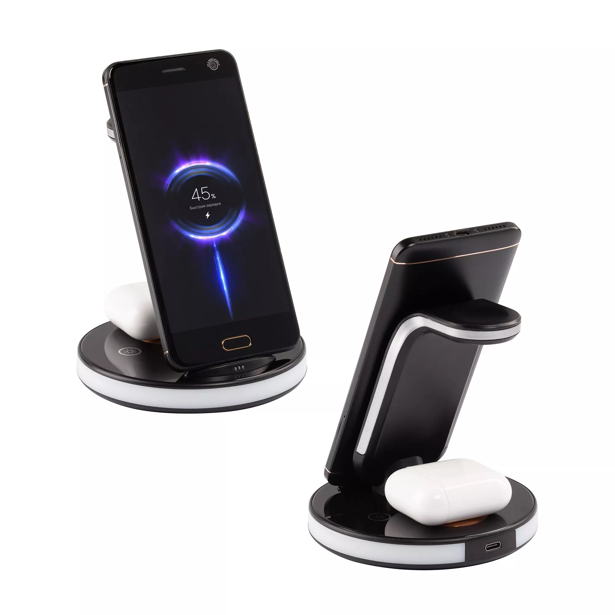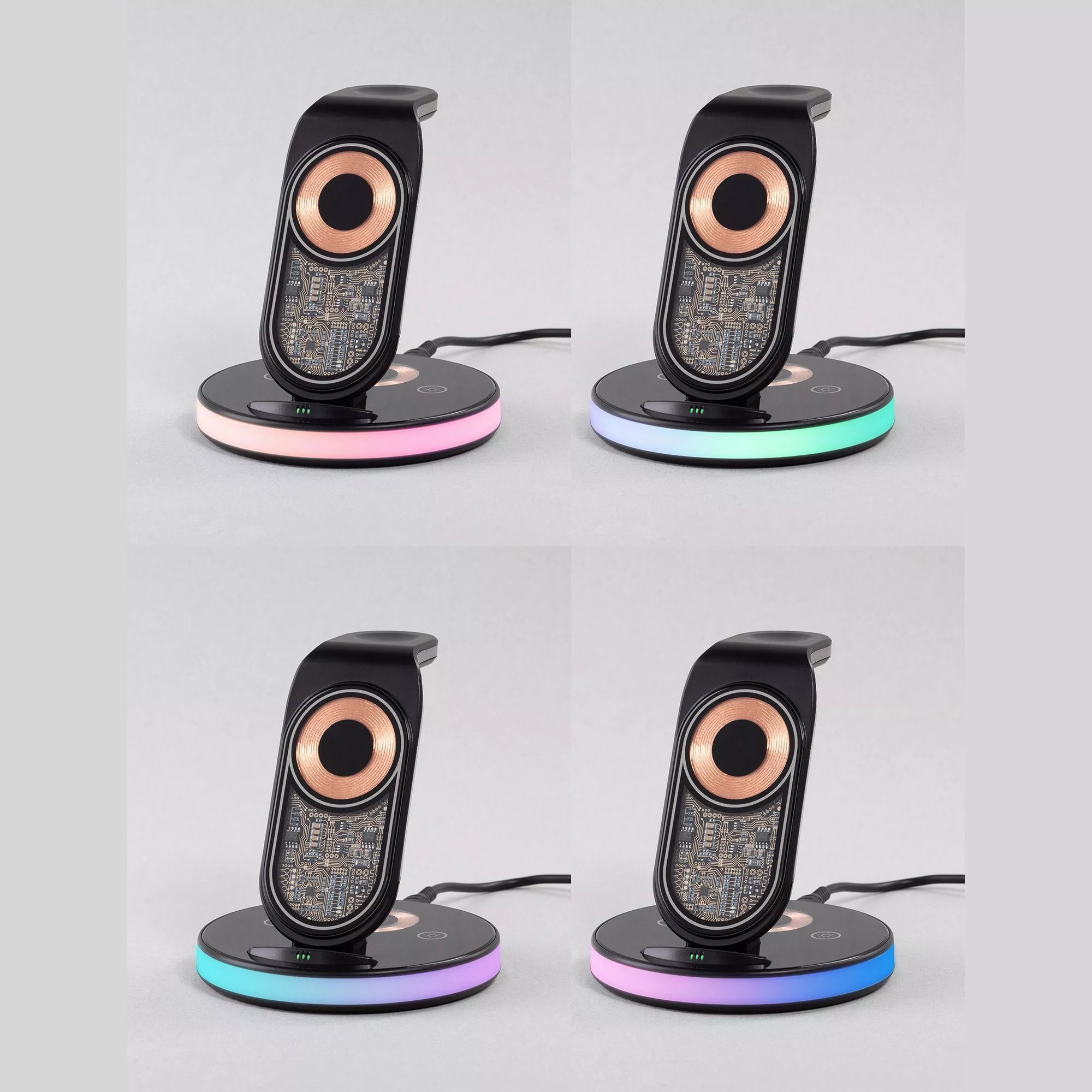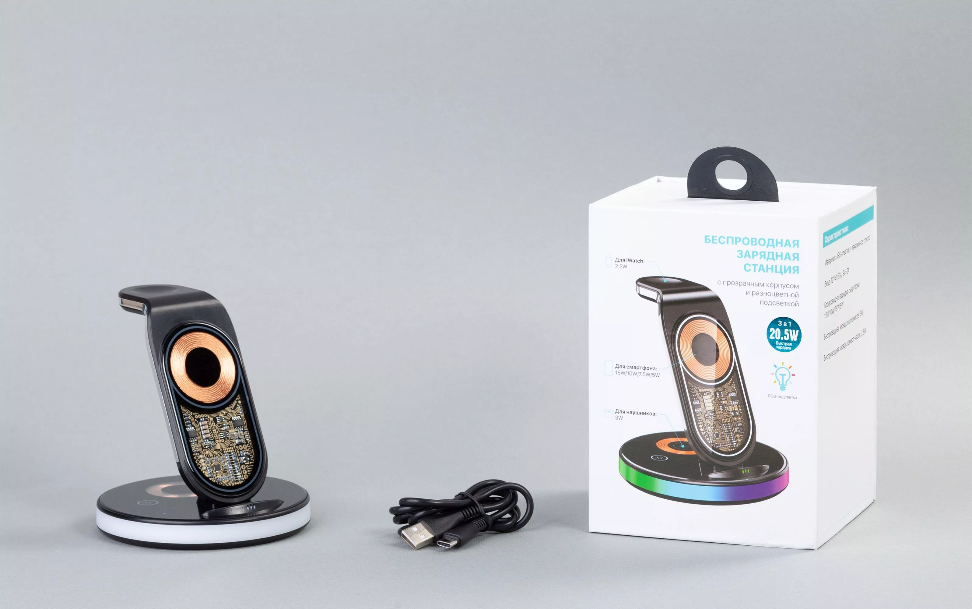 Оригинальный прозрачный дизайн корпуса-скелетона и быструю беспроводную зарядку всех Ваших смартфона, наушников и часов Apple Watch дополняют 2 световых режима - лампа-ночник с двумя уровнями яркости и разноцветная плавно меняющаяся RGB-подсветка. Управление режимами осуществляется сенсорными кнопками, находящимися на основании станции.