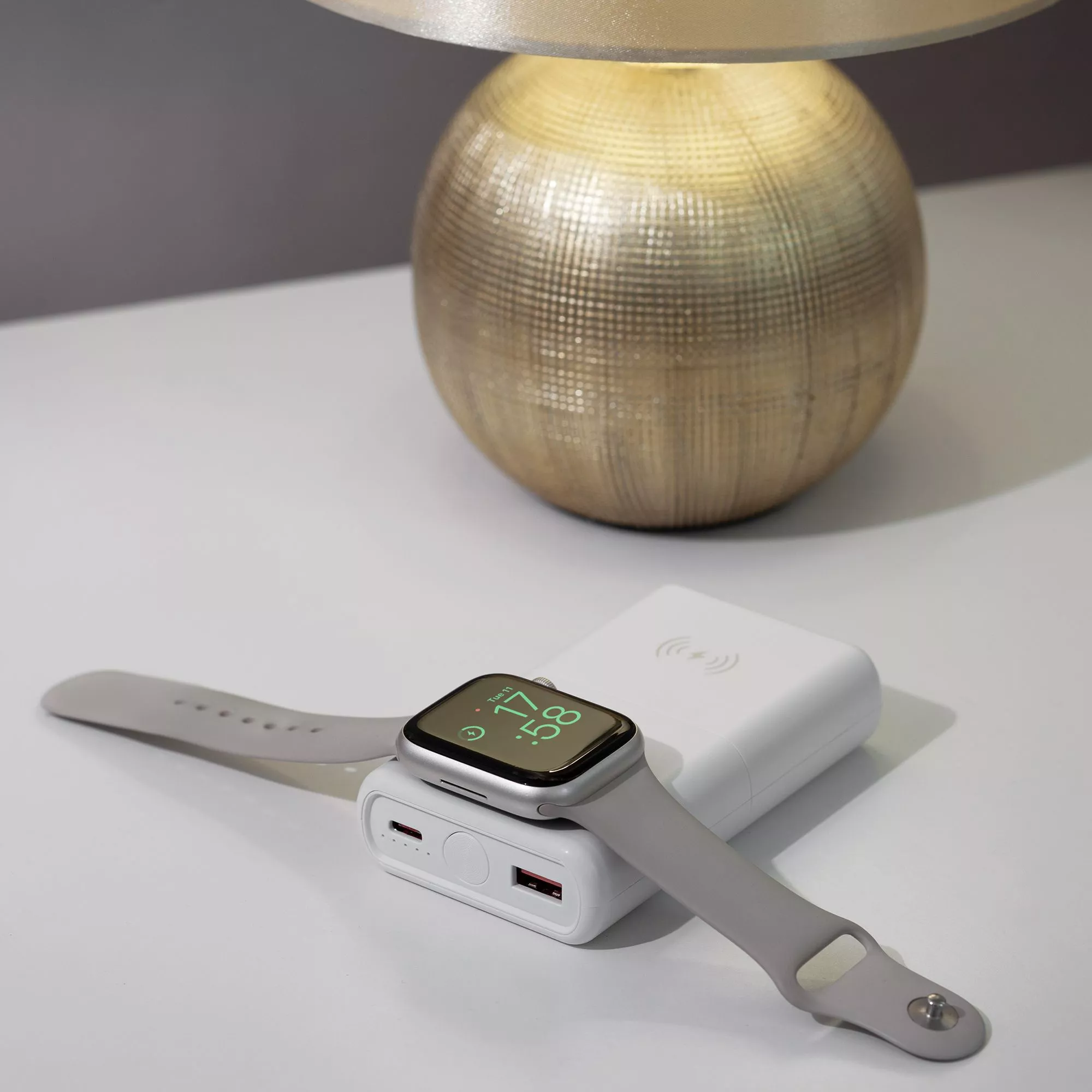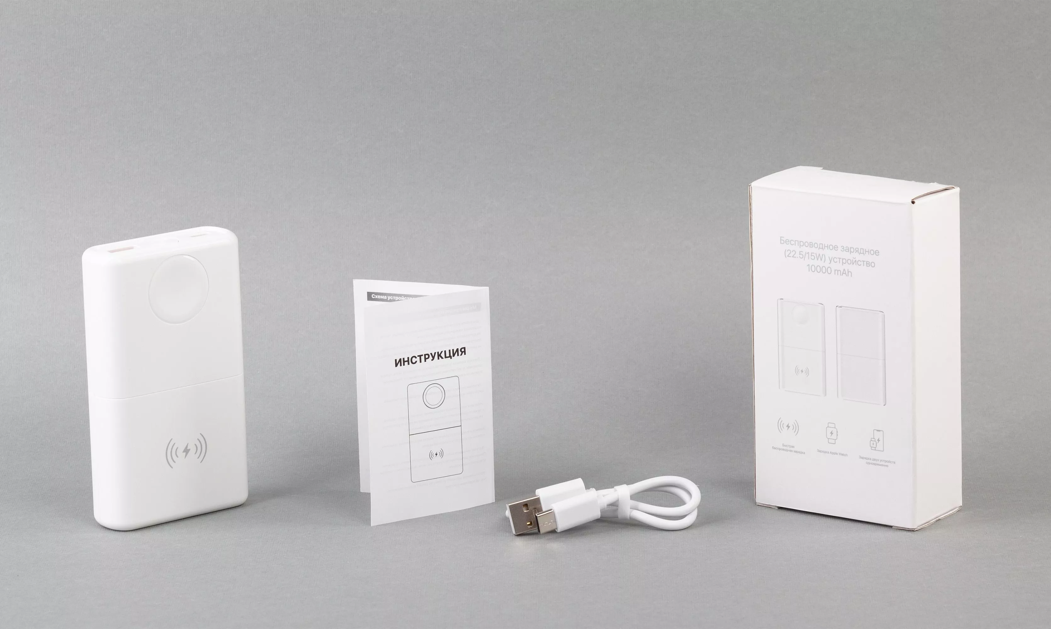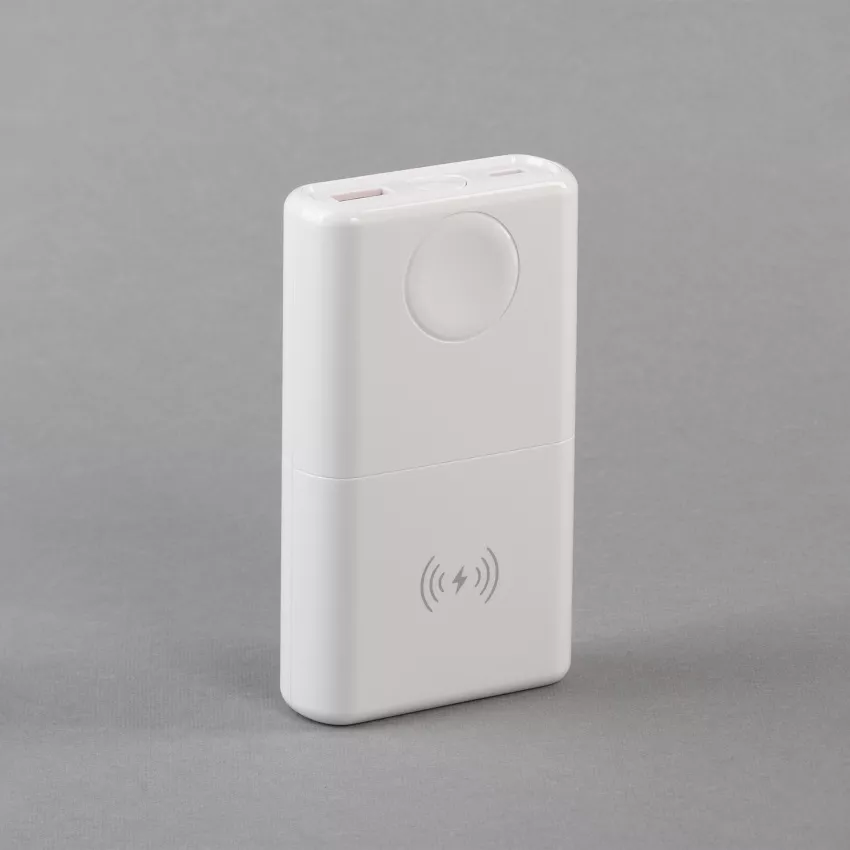 Гаджет объединяет в себе 2 устройства - пауэрбанк с увеличенной мощностью/скоростью зарядки через кабели и беспроводную быструю зарядную станцию для смартфона/смарт-часов Apple Watch/наушников.