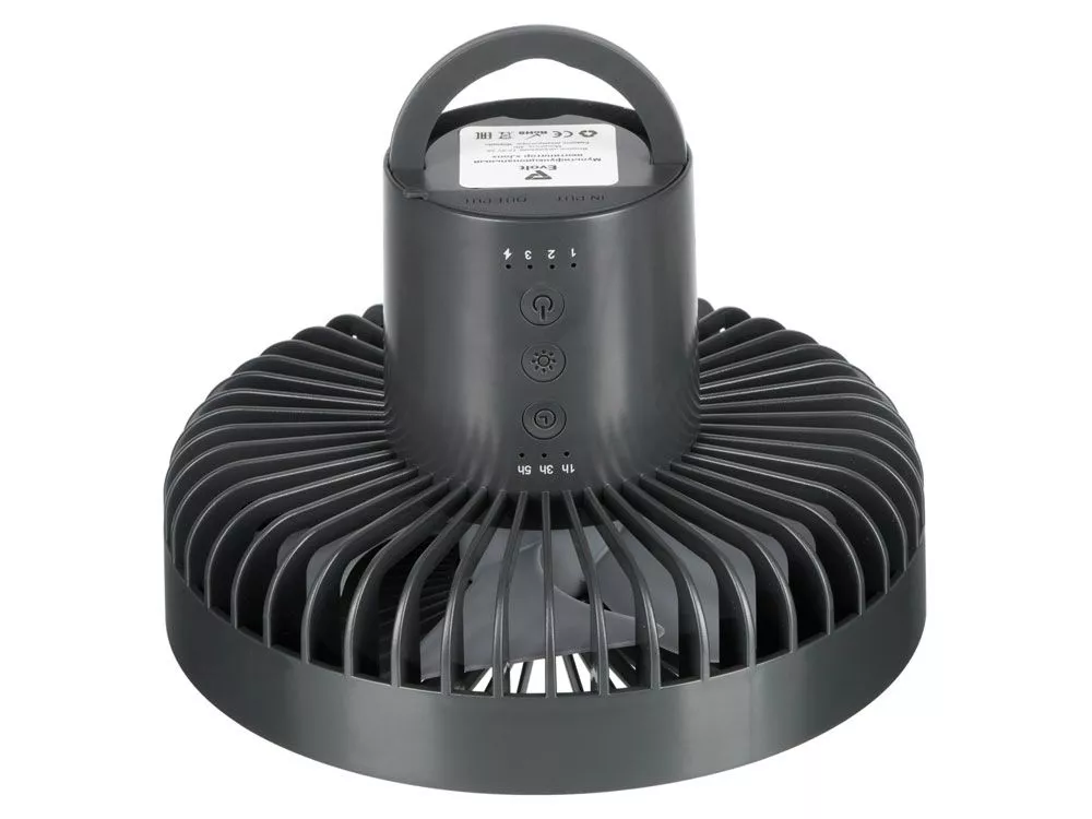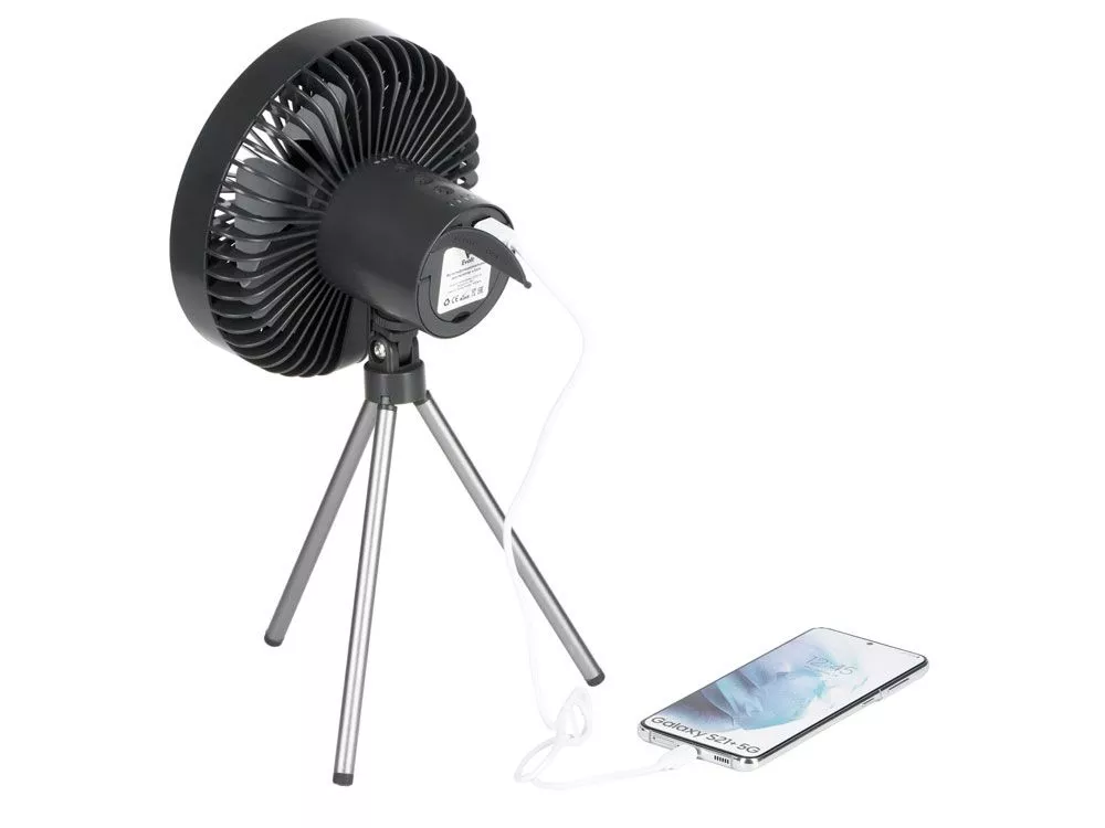 Ещё одна незаменимая функция для кэмпинга - возможность заряжать от вентилятора другие устройства (как от пауэрбанка), мощность аккумулятора - 3600 мА/ч.