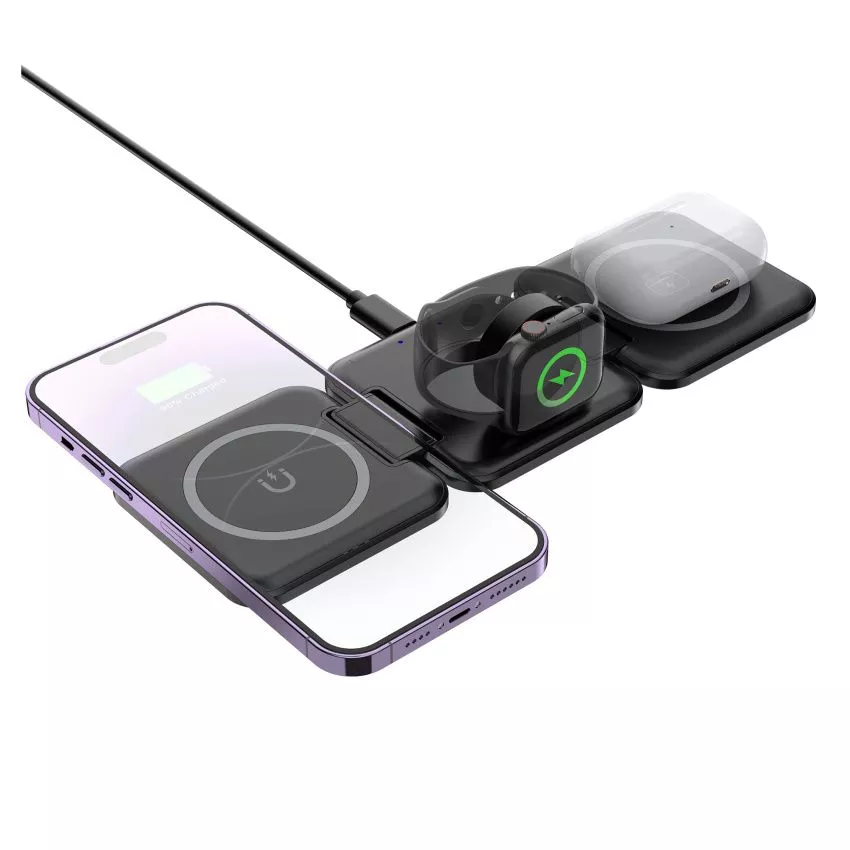 Зарядный блок станции для смартфона оснащён функцией MagSafe – магнитным держателем для iPhone двенадцатой серии и выше. Встроенные магниты слева от зарядного блока для смартфона и справа от зарядного блока для наушников позволяют сложить станцию в пирамиду-подставку - в данном положении появляется возможность закрепить iPhone горизонтально для удобного просмотра фото/видео на его экране.