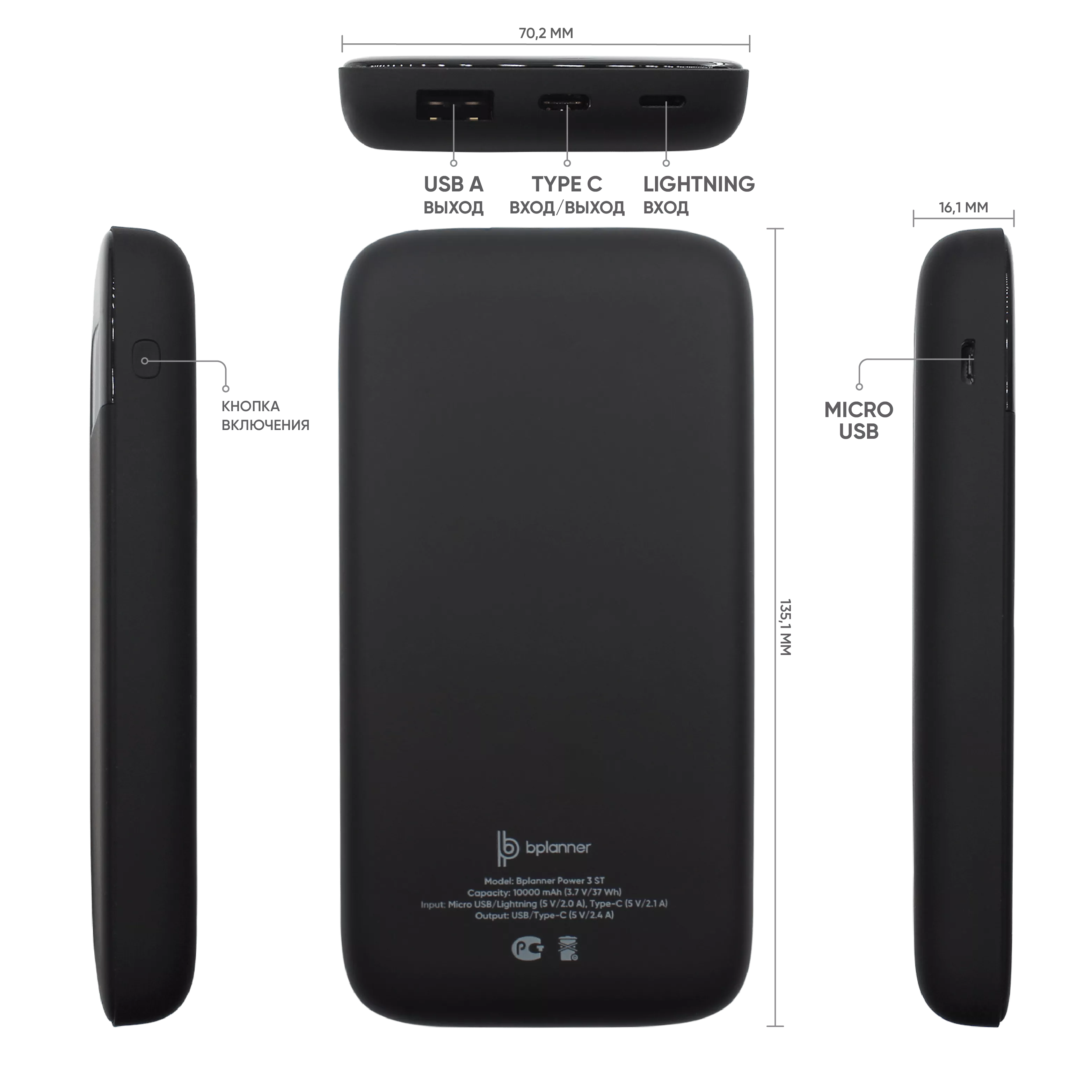 Внешний софт-тач аккумулятор Bplanner Power 3ST емкостью 10000 mAh оснащен цифровым индикатором заряда. Дизайн аккумулятора дополняет черный дисплей заряда на передней панели устройства. Внешний аккумулятор оснащен входом Type С, Micro-USB и Lightning, что упрощает процесс его зарядки. В комплекте идет кабель 3 в 1 и инструкция. Комбинируется с ежедневниками Bplanner 1, Bplanner 2, Bplanner 4 ,а также ручками с софт-тач покрытием.