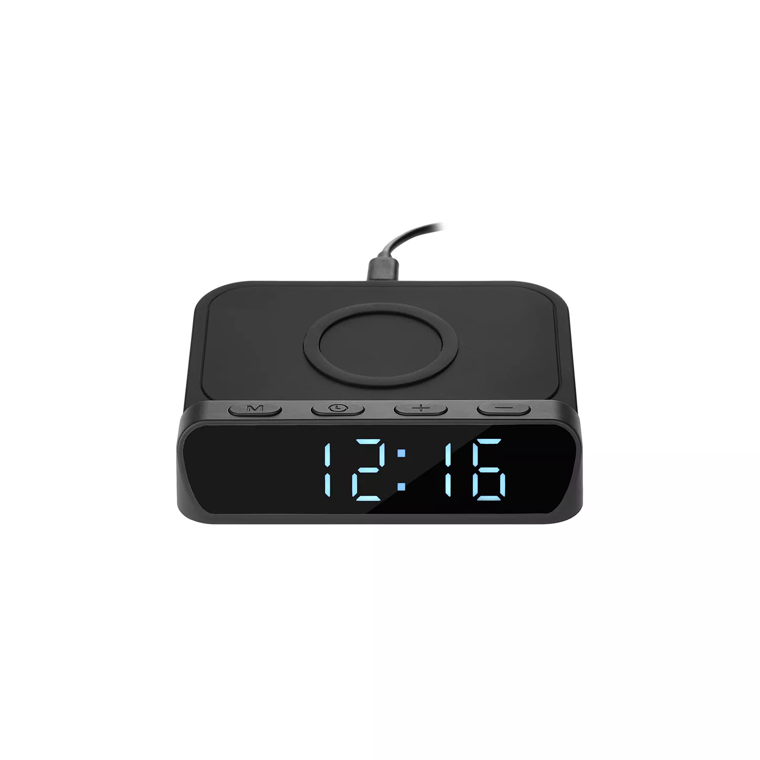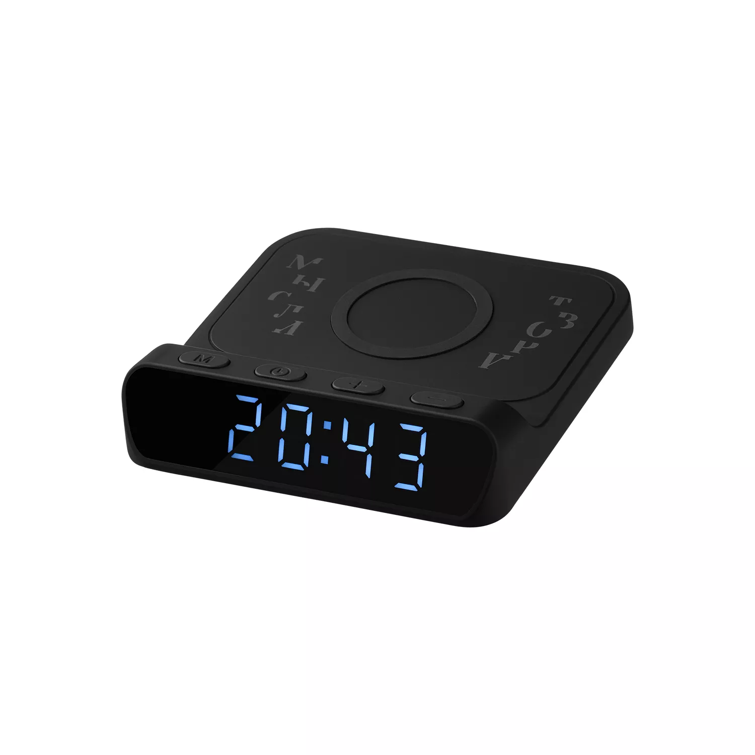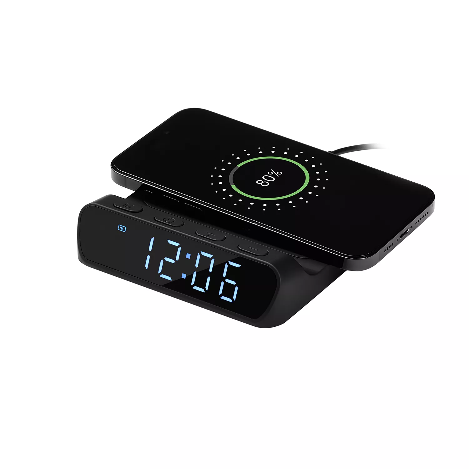 Зарядная станция 15W с часами и будильником. 12- или 24- формат времени. Три уровня яркости дисплея, индикаторы уровня заряда и будильника. Функция энергосбережения - после отключения питания внутренняя батарейка-«таблетка» сохраняет настройки часов, и после повторного подключения к питанию часы не нужно переустанавливать.