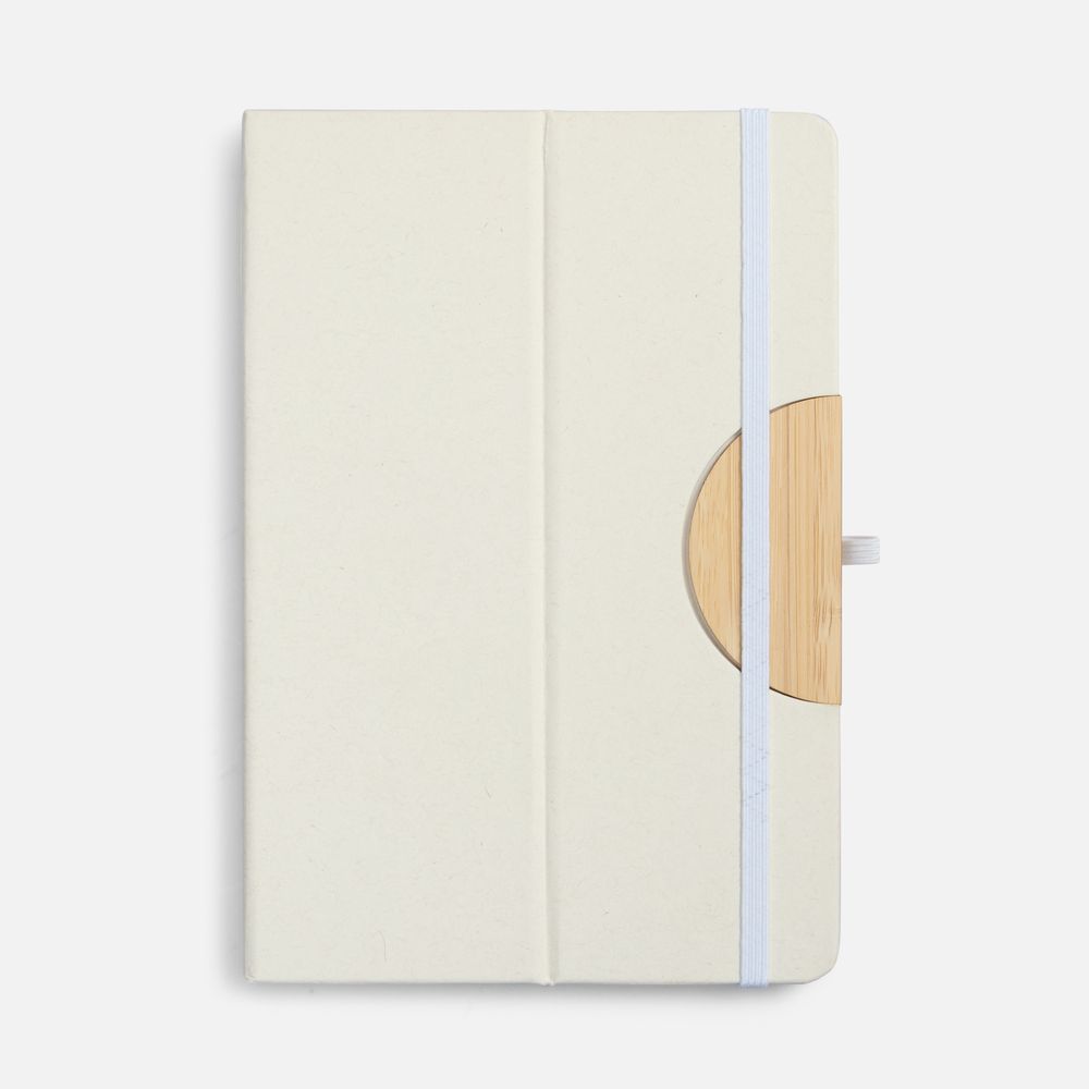 Блокнот из переработанных молочных пакетов, дополнен цветными петлей-резинкой для ручки, белым ляссе и резинкой на обложку.
