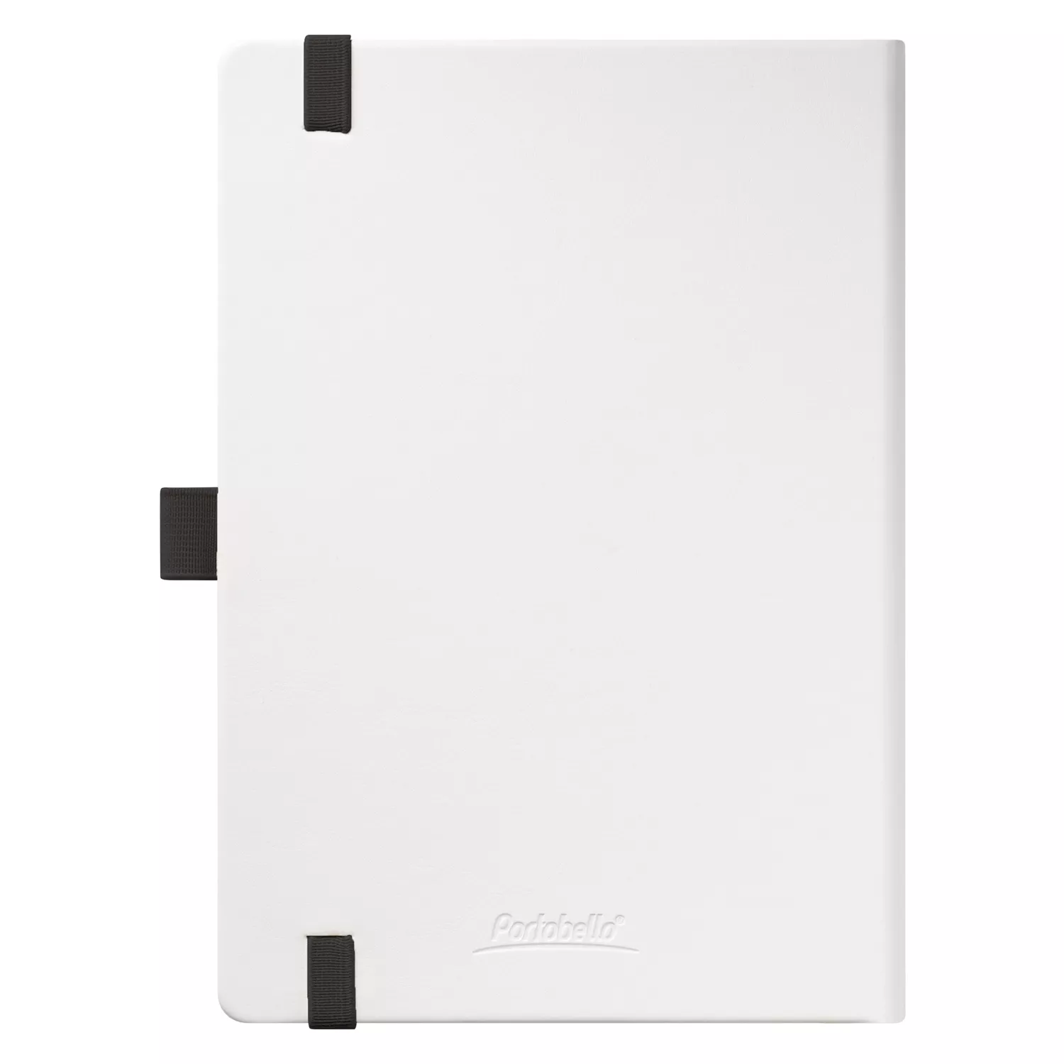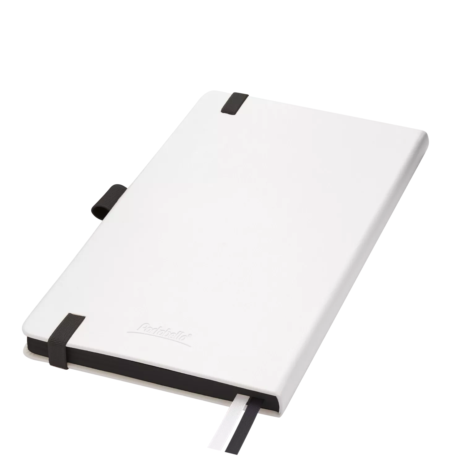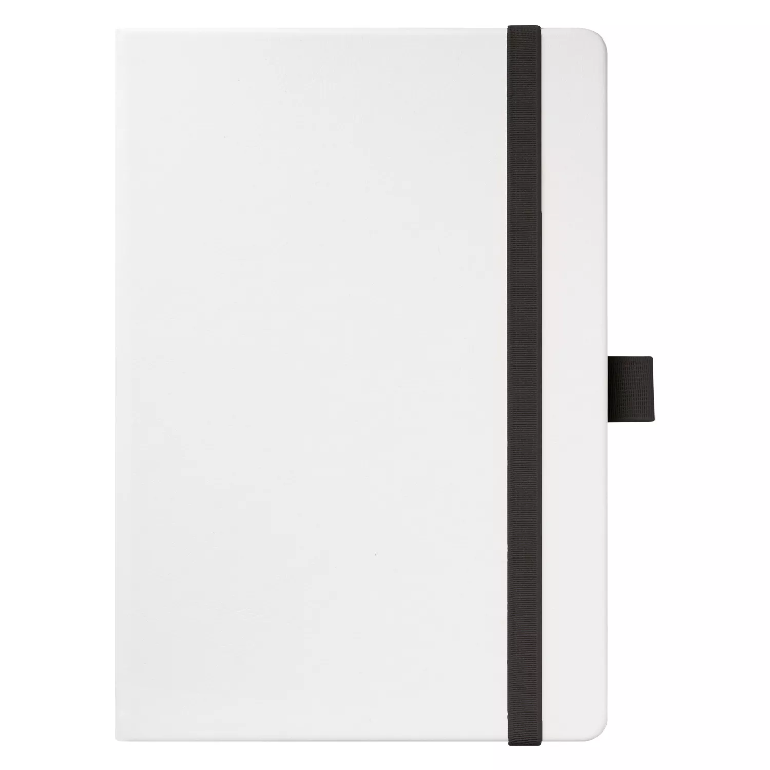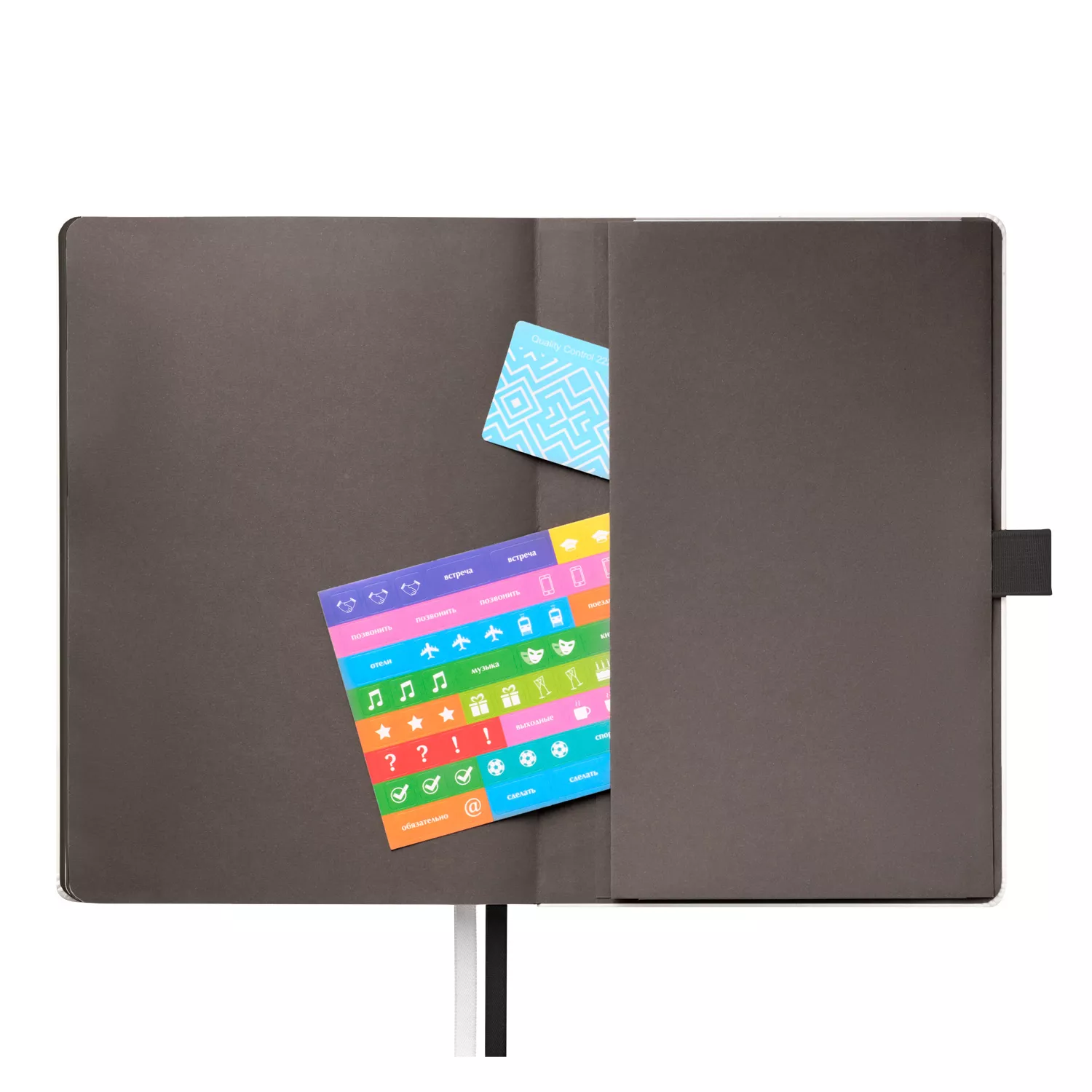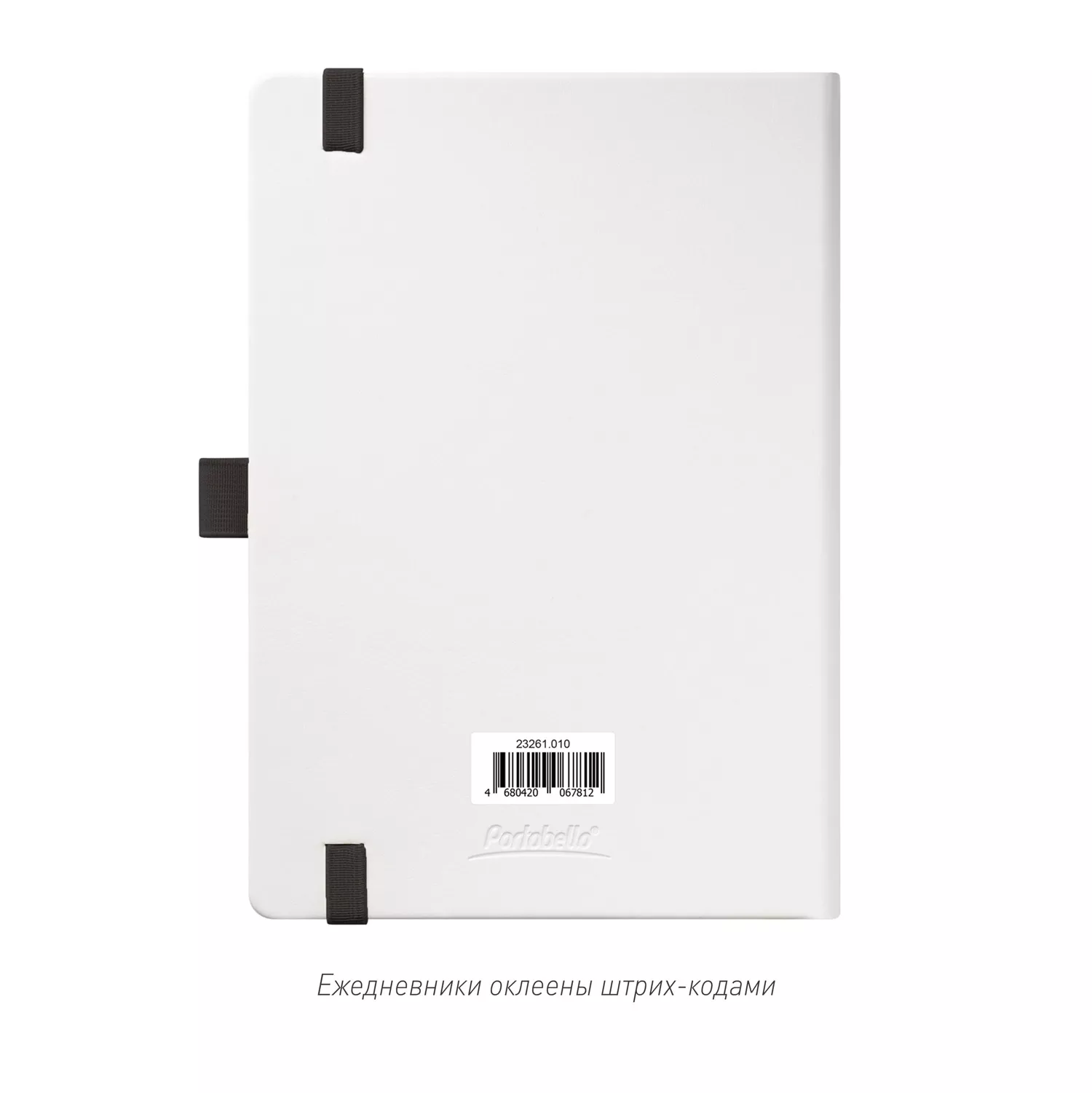 Недатированный ежедневник выполнен в жесткой обложке из искусственной кожи со скругленными уголками. Переплетный материал гладкий, с легкой естественной паутинкой морщин, имеет полуглянцевый блеск. Цвет – чистый белый. Черные матовые форзац и нахзац, а также черный срез блока создают оригинальный динамичный цветовой ансамбль и подчеркивают белизну обложки. Страницы светло-кремового цвета, из гладкого офсета, слегка шелковистые, со скругленными уголками. Добавляют изделию мягкую комфортную теплоту. Двойное атласное ляссе составлено из черной и белой лент. Каждая шириной 6 мм, имеет легкий блеск. Вертикальная фиксирующая резинка прочная, надежная и удобная, в тон срезу. Есть петелька для ручки в тон резинки. Карман на заднем форзаце.