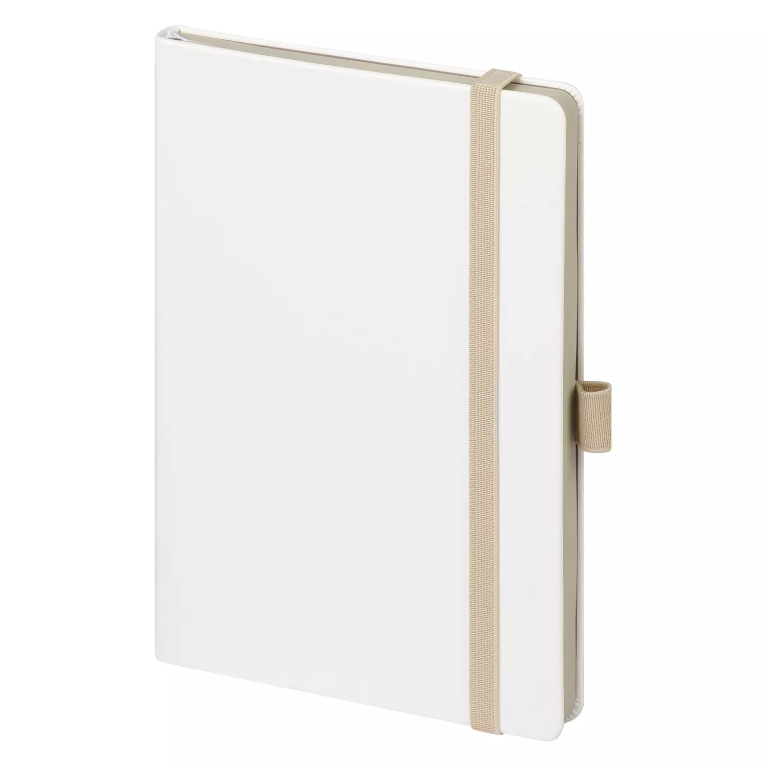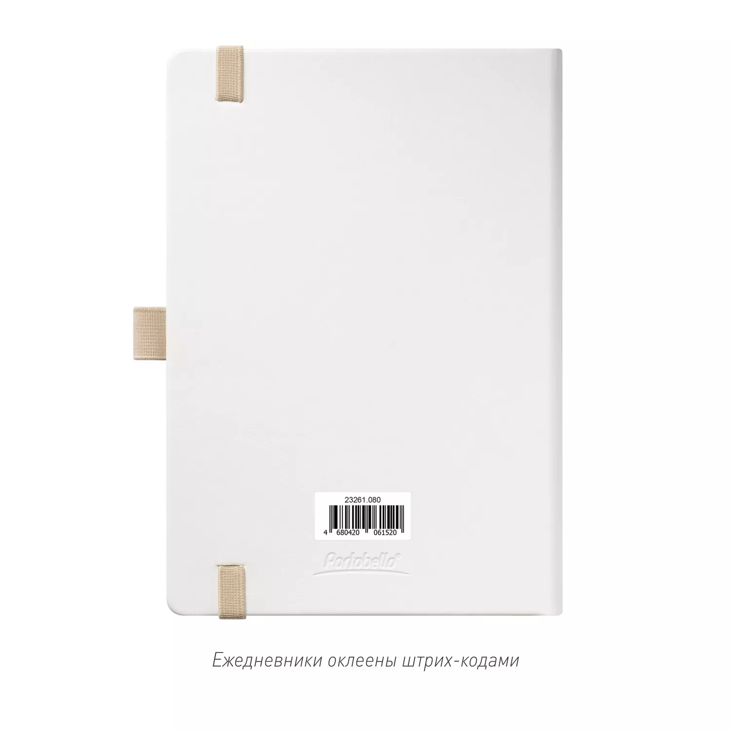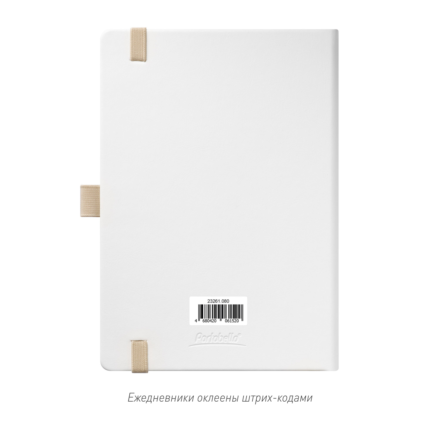 Недатированный ежедневник выполнен в жесткой обложке из искусственной кожи со скругленными уголками. Переплетный материал гладкий, с легкой естественной паутинкой морщин, имеет полуглянцевый блеск. Цвет – чистый белый. Серые матовые форзац и нахзац, а также серо-бежевый срез блока создают оригинальный динамичный цветовой ансамбль и подчеркивают белизну обложки. Страницы светло-кремового цвета, из гладкого офсета, слегка шелковистые, со скругленными уголками. Добавляют изделию мягкую комфортную теплоту. Двойное атласное ляссе составлено из серой и белой лент. Каждая шириной 6 мм, имеет легкий блеск. Вертикальная фиксирующая резинка прочная, надежная и удобная, в тон срезу. Есть петелька для ручки в тон резинки. Карман на заднем форзаце.