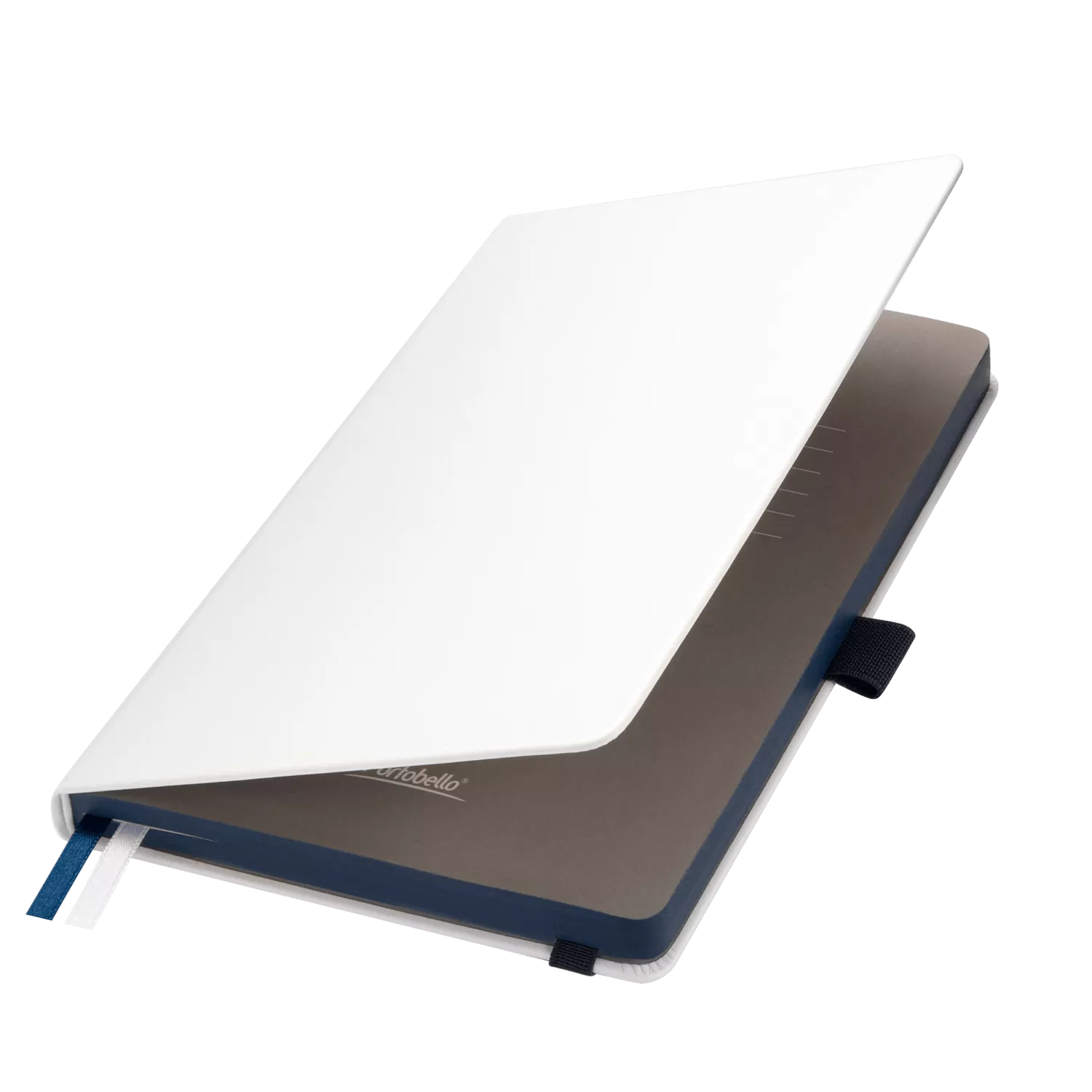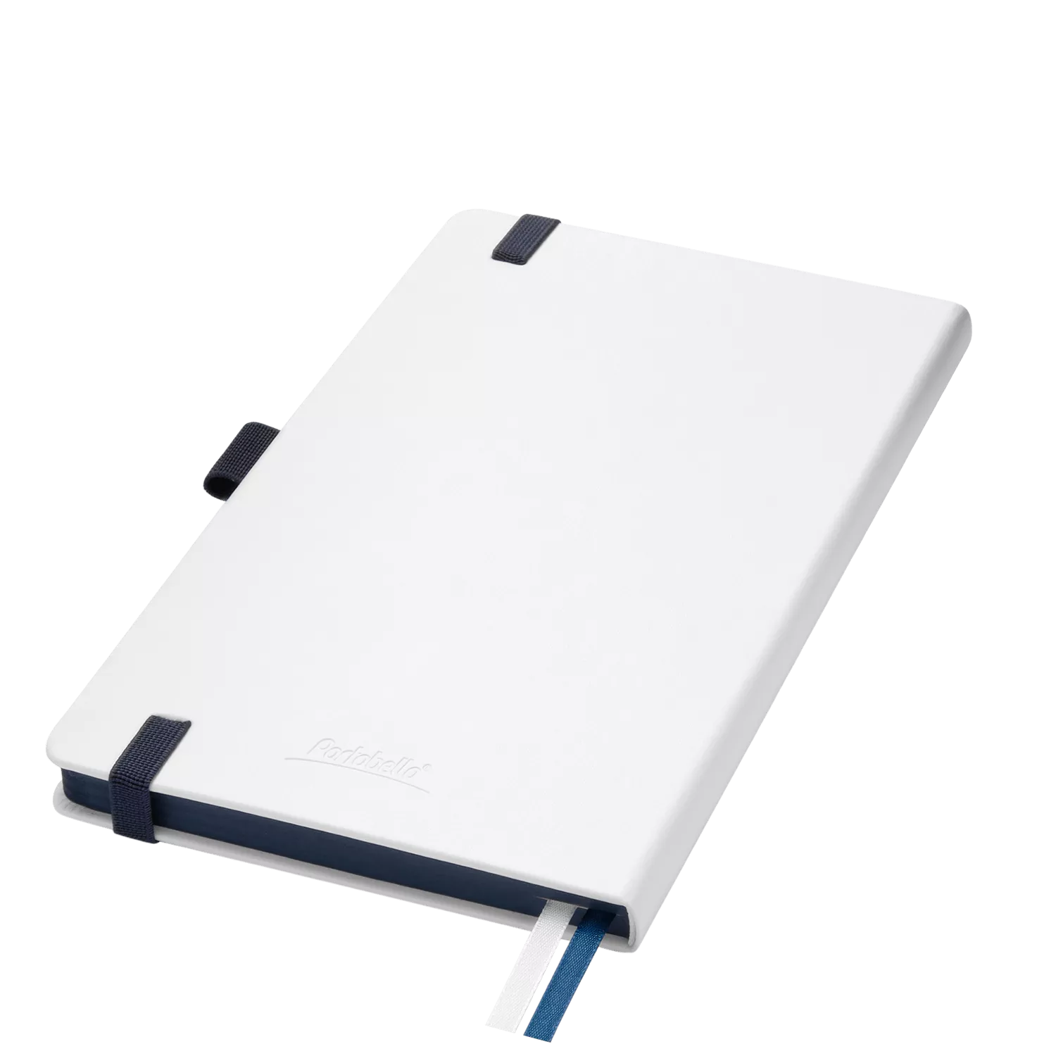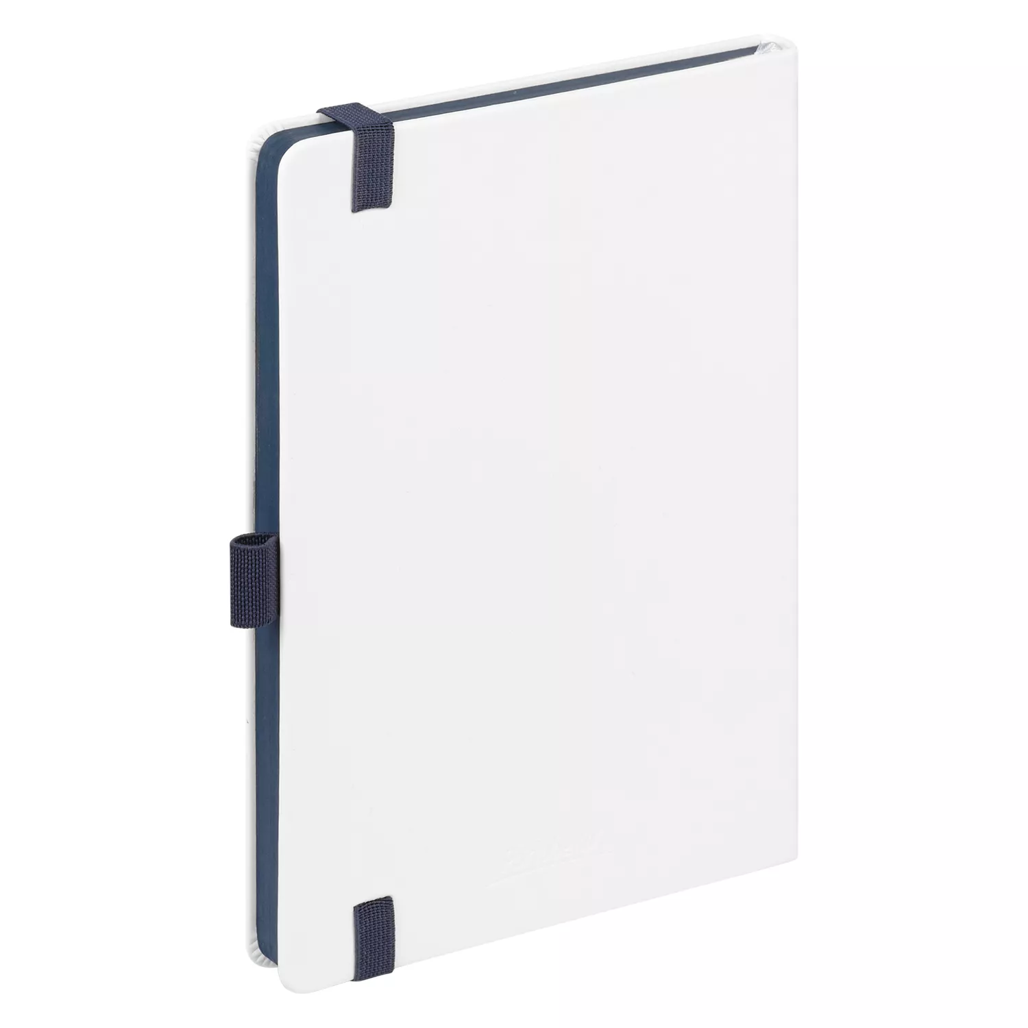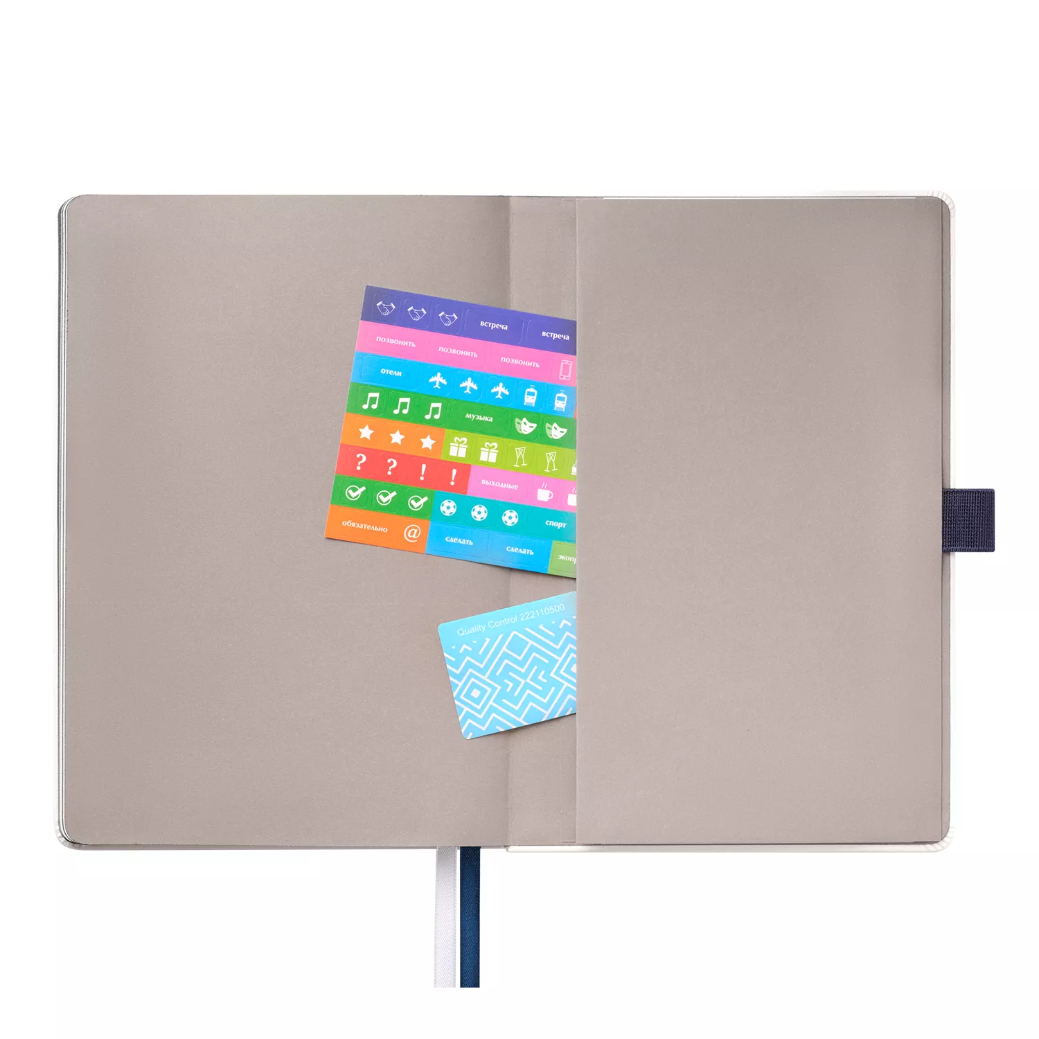 Недатированный ежедневник выполнен в жесткой обложке из искусственной кожи со скругленными уголками. Переплетный материал гладкий, с легкой естественной паутинкой морщин, имеет полуглянцевый блеск. Цвет – чистый белый. Серые матовые форзац и нахзац, а также синий срез блока создают оригинальный динамичный цветовой ансамбль и подчеркивают белизну обложки. Страницы светло-кремового цвета, из гладкого офсета, слегка шелковистые, со скругленными уголками. Добавляют изделию мягкую комфортную теплоту. Двойное атласное ляссе составлено из синей и белой лент. Каждая шириной 6 мм, имеет легкий блеск. Вертикальная фиксирующая резинка прочная, надежная и удобная, в тон срезу. Есть петелька для ручки в тон резинки. Карман на заднем форзаце.