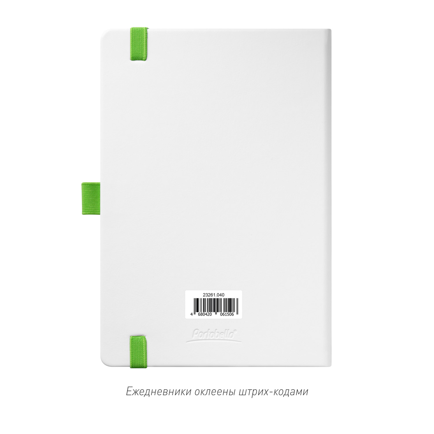 Недатированный ежедневник выполнен в жесткой обложке из искусственной кожи со скругленными уголками. Переплетный материал гладкий, с легкой естественной паутинкой морщин, имеет полуглянцевый блеск. Цвет – чистый белый. Серые матовые форзац и нахзац, а также зеленый срез блока создают оригинальный динамичный цветовой ансамбль и подчеркивают белизну обложки. Страницы светло-кремового цвета, из гладкого офсета, слегка шелковистые, со скругленными уголками. Добавляют изделию мягкую комфортную теплоту. Двойное атласное ляссе составлено из зеленой и белой лент. Каждая шириной 6 мм, имеет легкий блеск. Вертикальная фиксирующая резинка прочная, надежная и удобная, в тон срезу. Есть петелька для ручки в тон резинки. Карман на заднем форзаце.