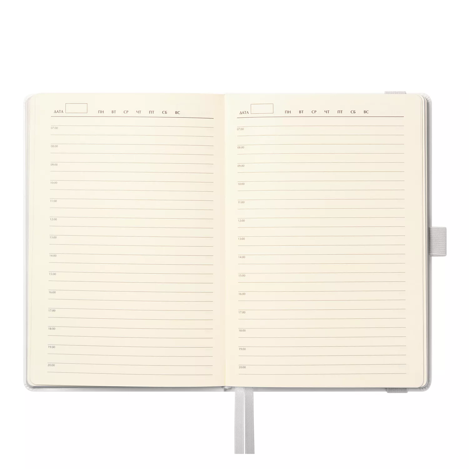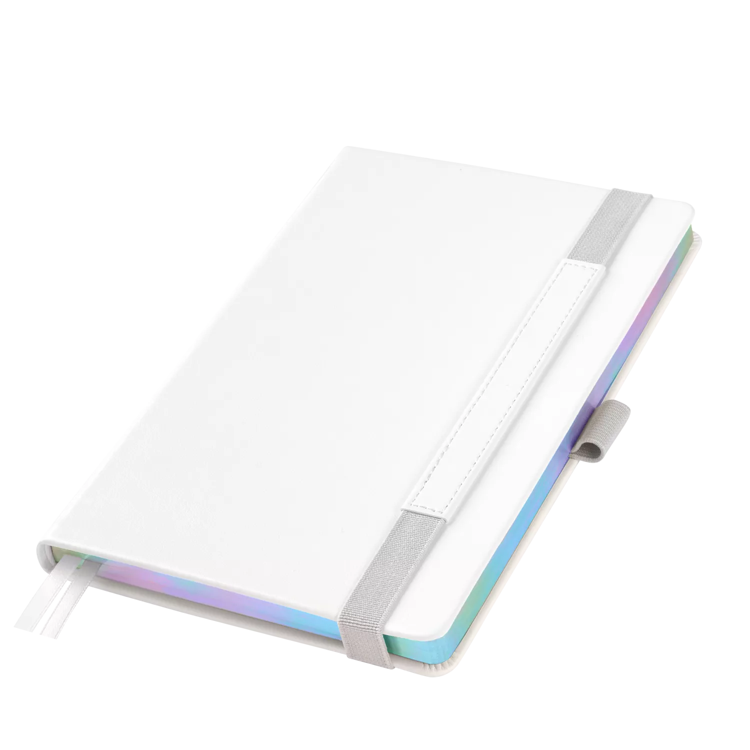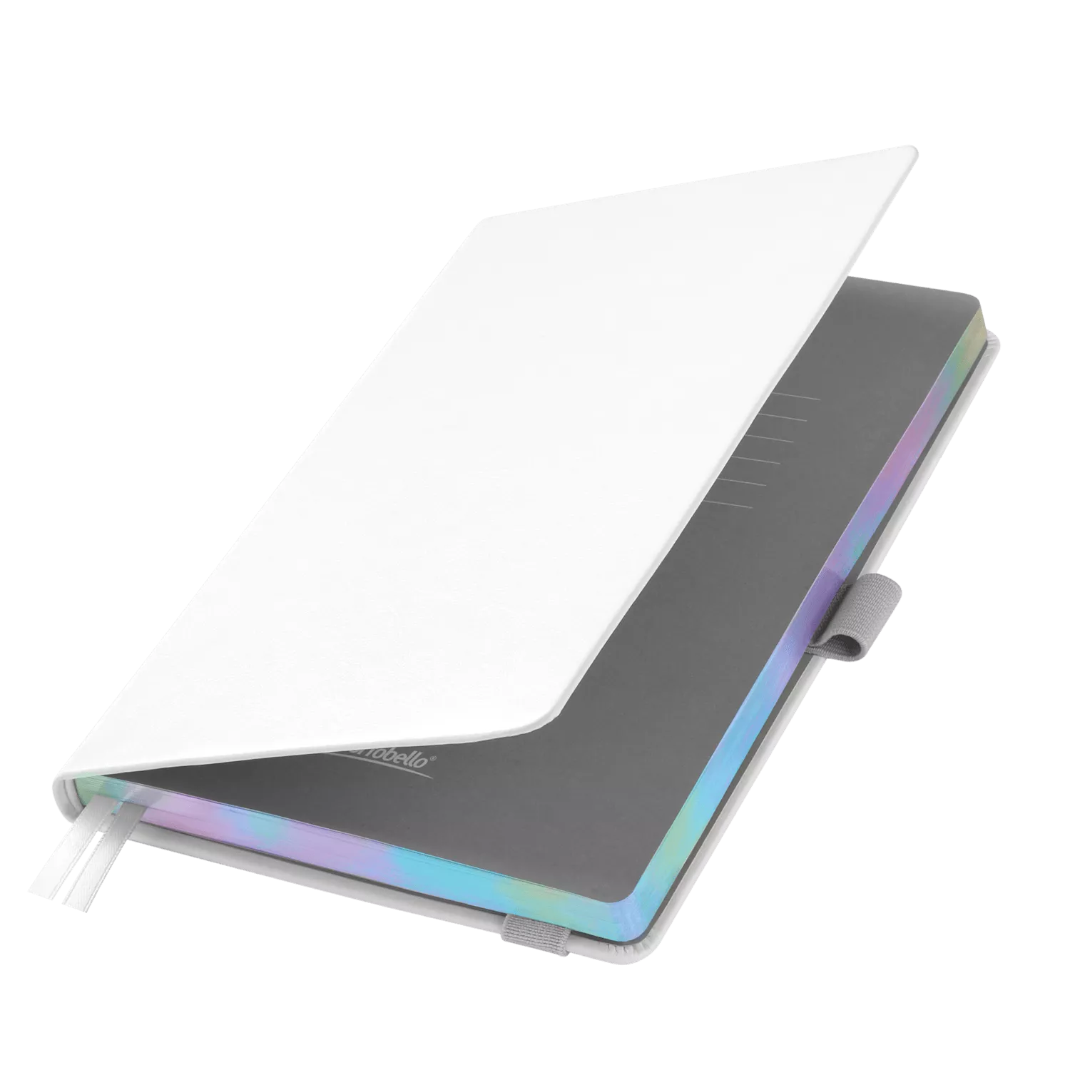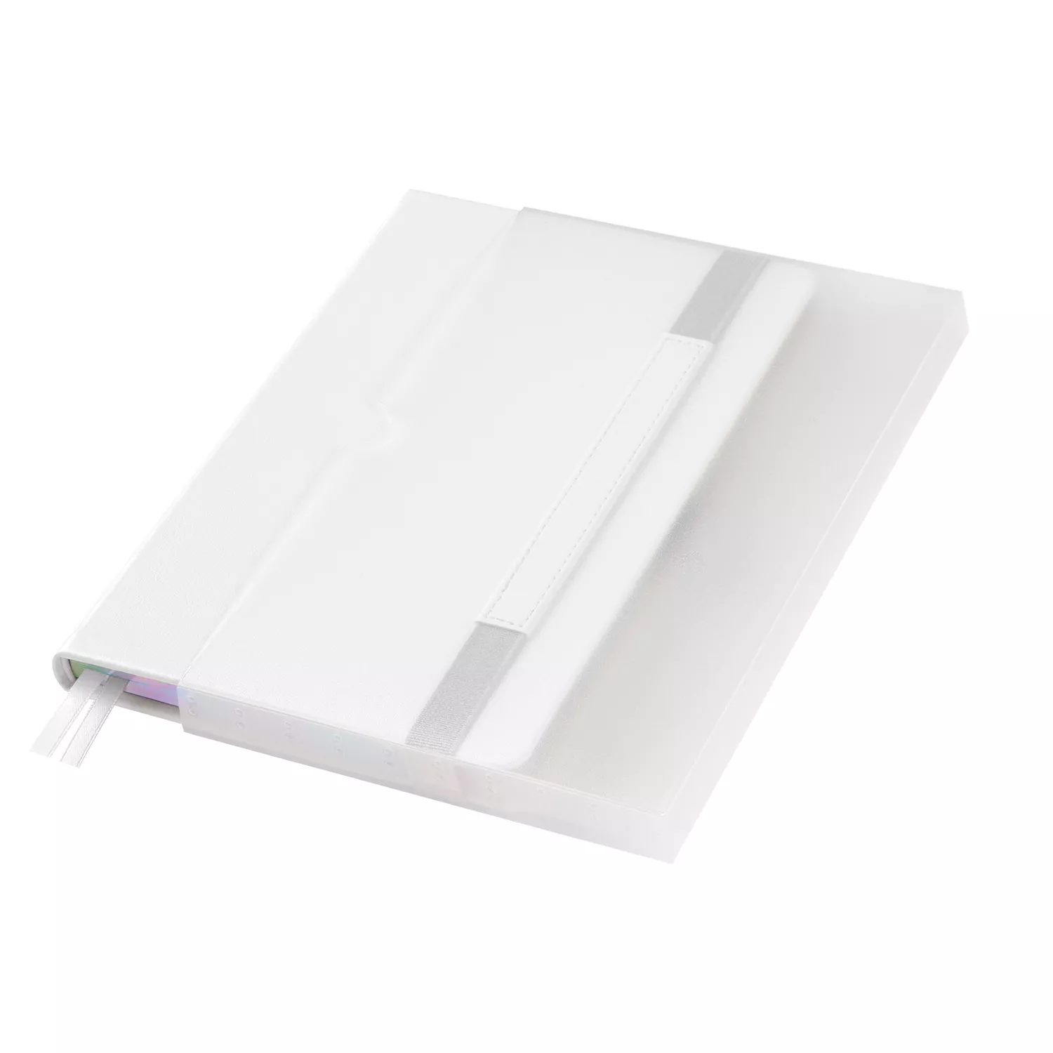 Недатированный ежедневник в жесткой обложке из качественной искусственной кожи. Материал обложки гладкий, текстурированный, с полуглянцевым блеском. Скругленные углы обложки и внутреннего блока. Отличительная особенность коллекции — голографический фольгированный срез блока. Форзац/нахзац– серые. Вариант в жесткой обложке украшен широкой вертикальной резинкой-фиксатором с вставкой из ПУ-материала обложки и петелькой под ручку, а также двойным ляссе (серым и в тон обложки).
