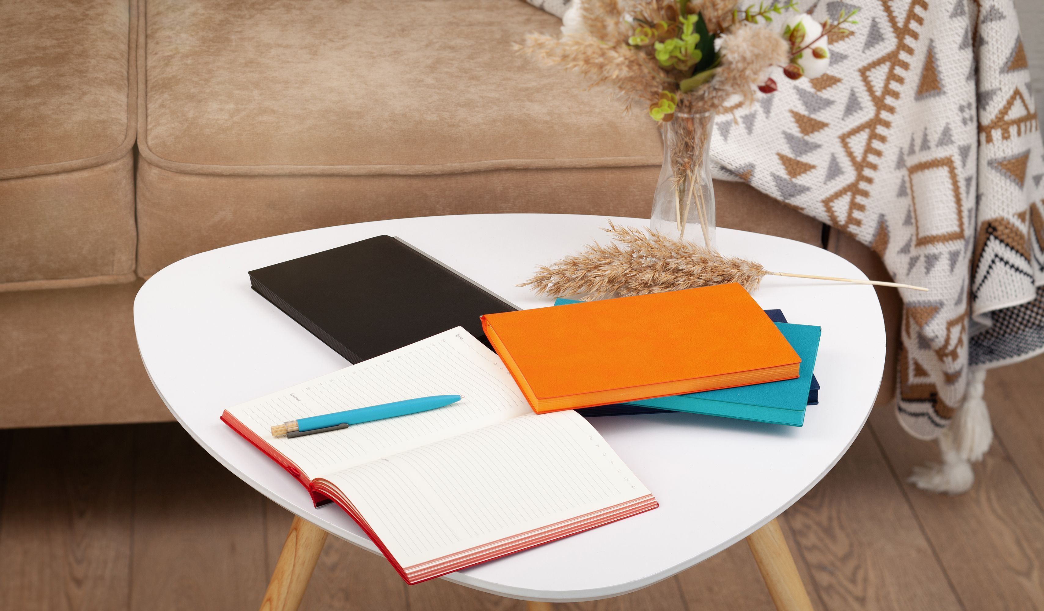 Притягивает внимание, офисные принадлежности и желание что-нибудь срочно записать. Минималистичный в оформлении ежедневник «Аскона» представлен в ярких насыщенных цветах с цветным срезом. Гибкая обложка имеет фактуру натуральной кожи, её дополняет металлическая планка корешка. Блок из плотной тонированной бумаги в 256 страниц удобно использовать с синей лентой-ляссе в цвет среза ежедневника.