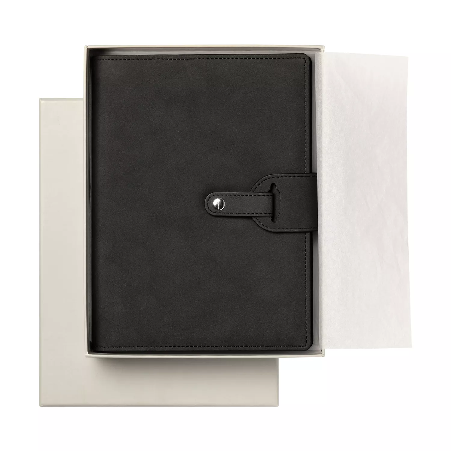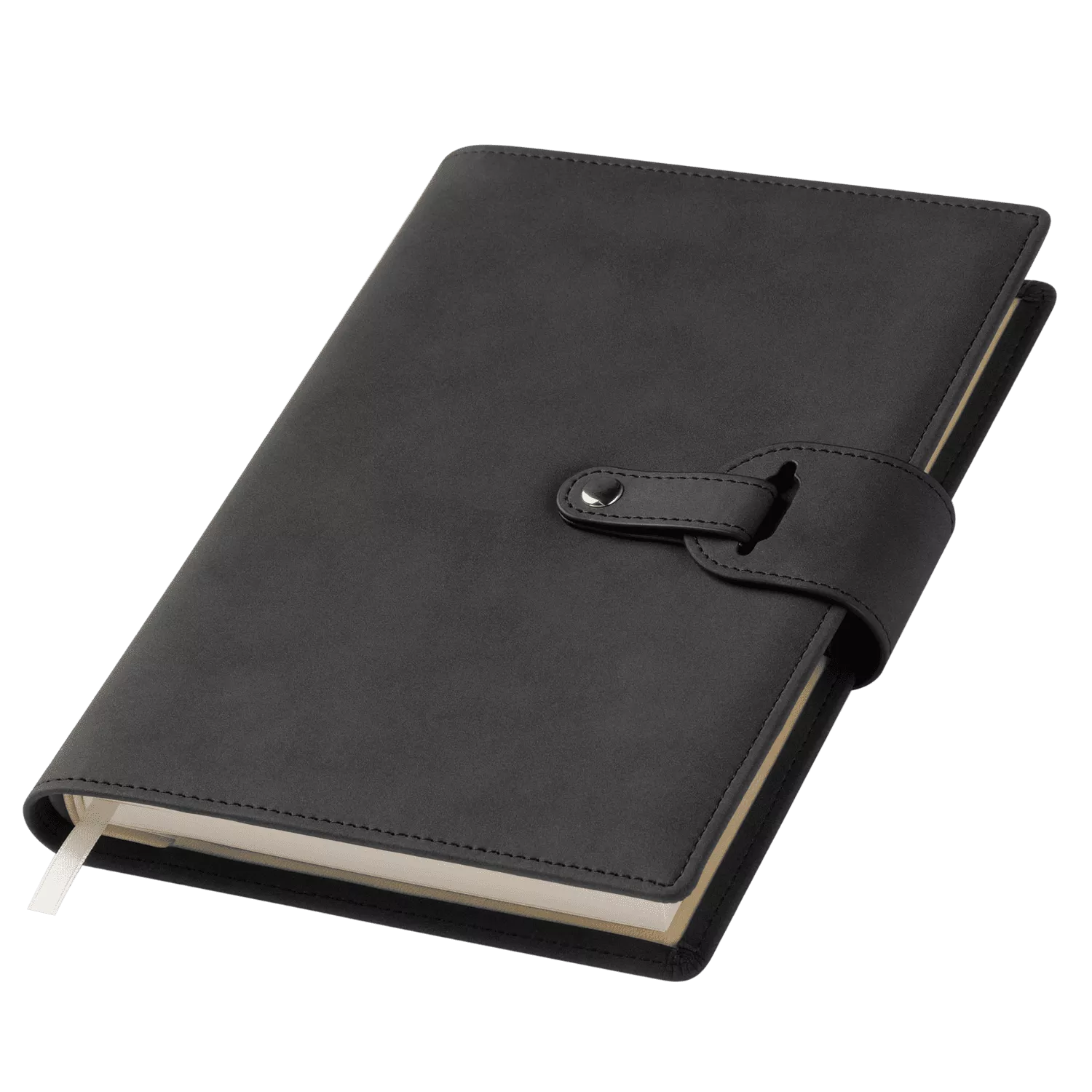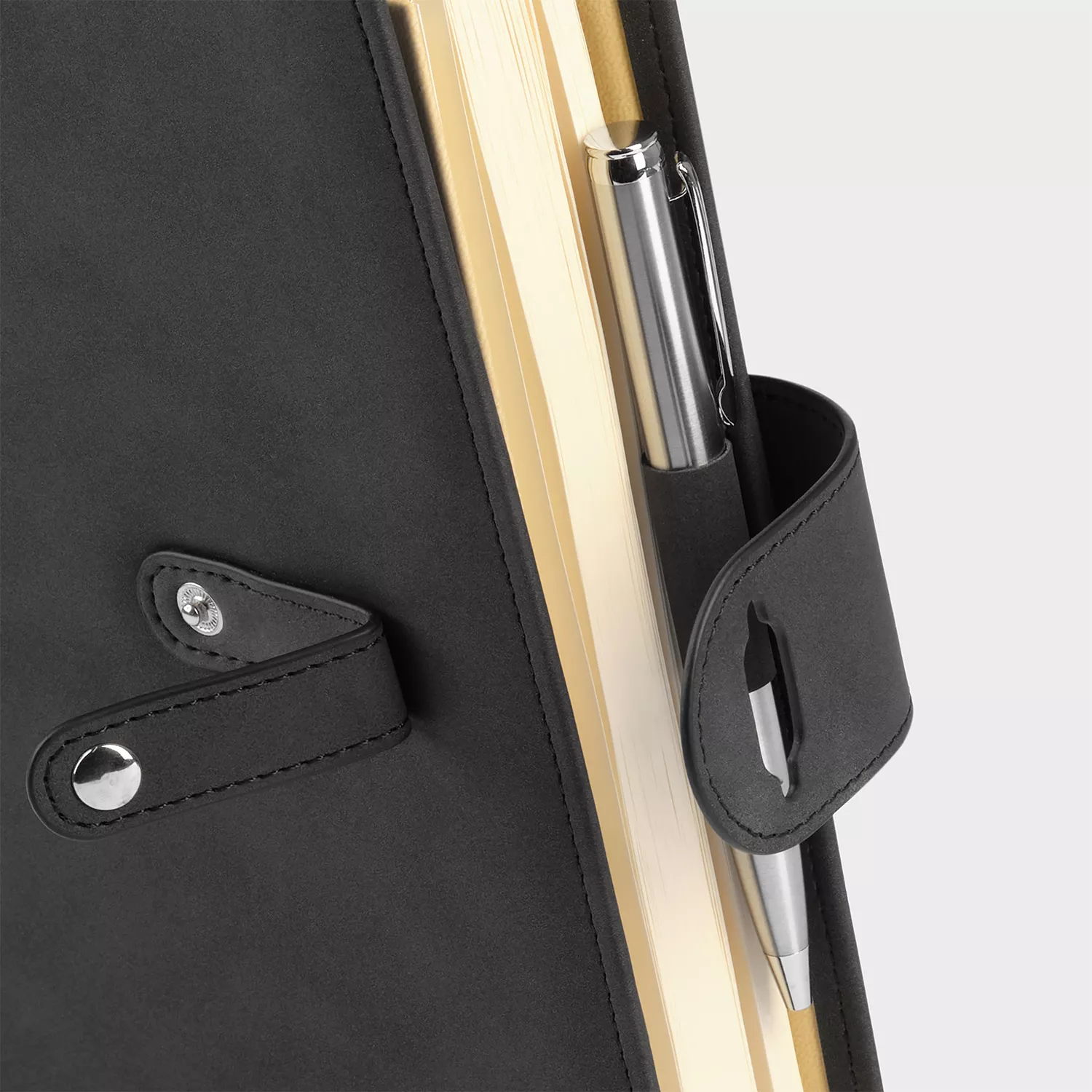 Застежка двойная – состоит из ремешка с металлической кнопкой и декоративной петли из материала обложки