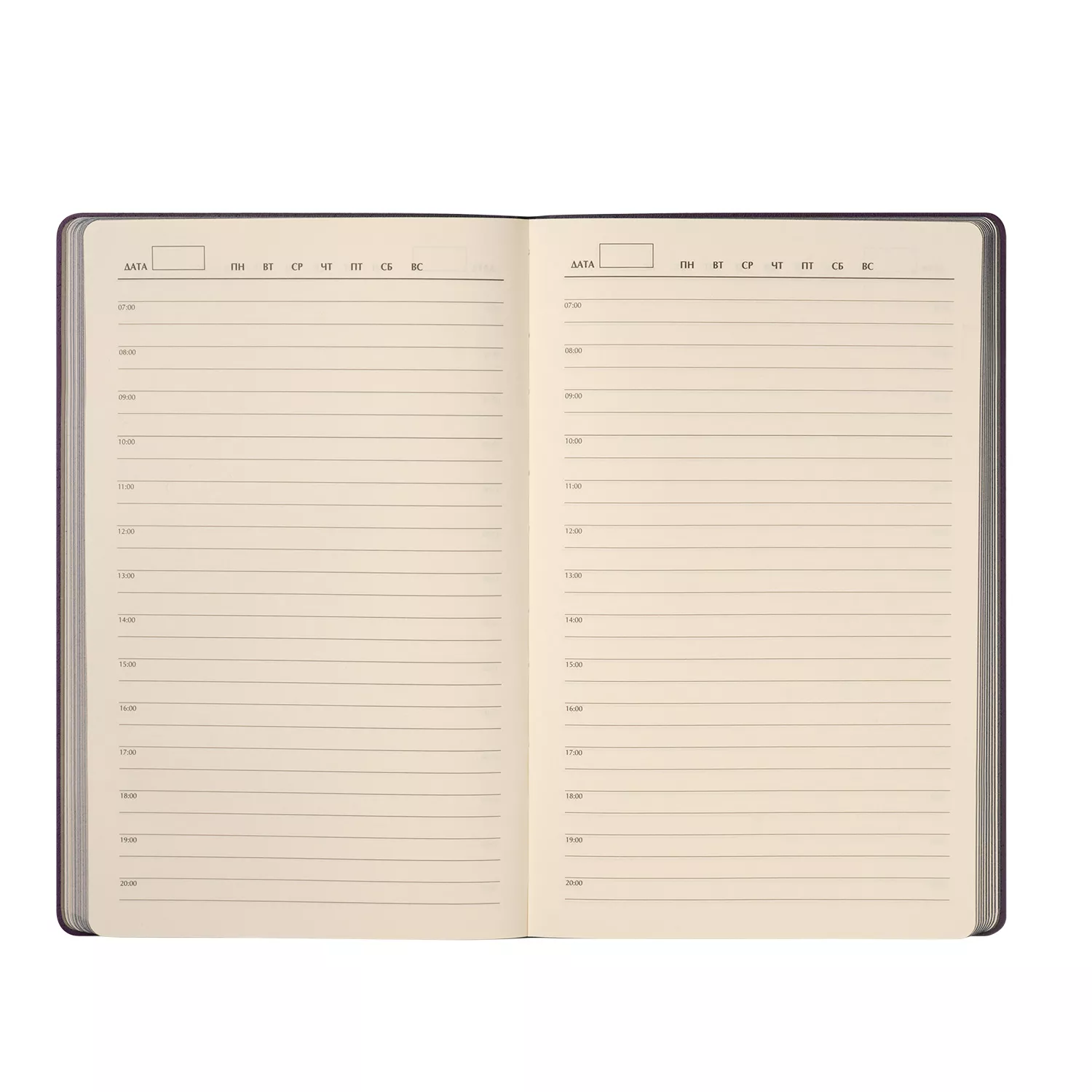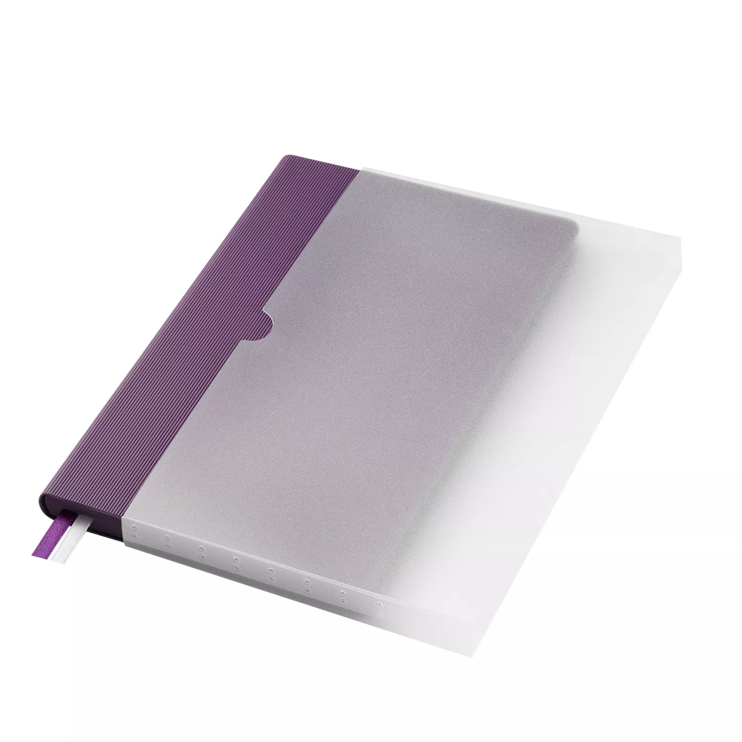 Недатированный ежедневник отличается современным технологичным дизайном и оригинальным цветовым ансамблем. Гибкая матовая обложка со скругленными уголками выполнена из искусственной кожи, имитирующей покрытие в стиле Hi-Tech. Переплетный материал с вертикальным рифлением, бархатистый, со слегка прорезиненным эффектом. За счет интересной рельефной фактуры прослеживается игра цвета при перемене освещения. Цвет – фиолетовый, насыщенный, плотный, однородный. Создает органичный природный тандем с матовыми форзацем и нахзацем серого цвета. Срез матовый, в тон обложки. Страницы со скругленными уголками приятного глазу теплого светло-кремового цвета. Выполнены из гладкого шелковистого офсета. Ежедневник дополнен двойным атласным ляссе из лент серого и фиолетового цветов, имеющих глянцевый отлив.