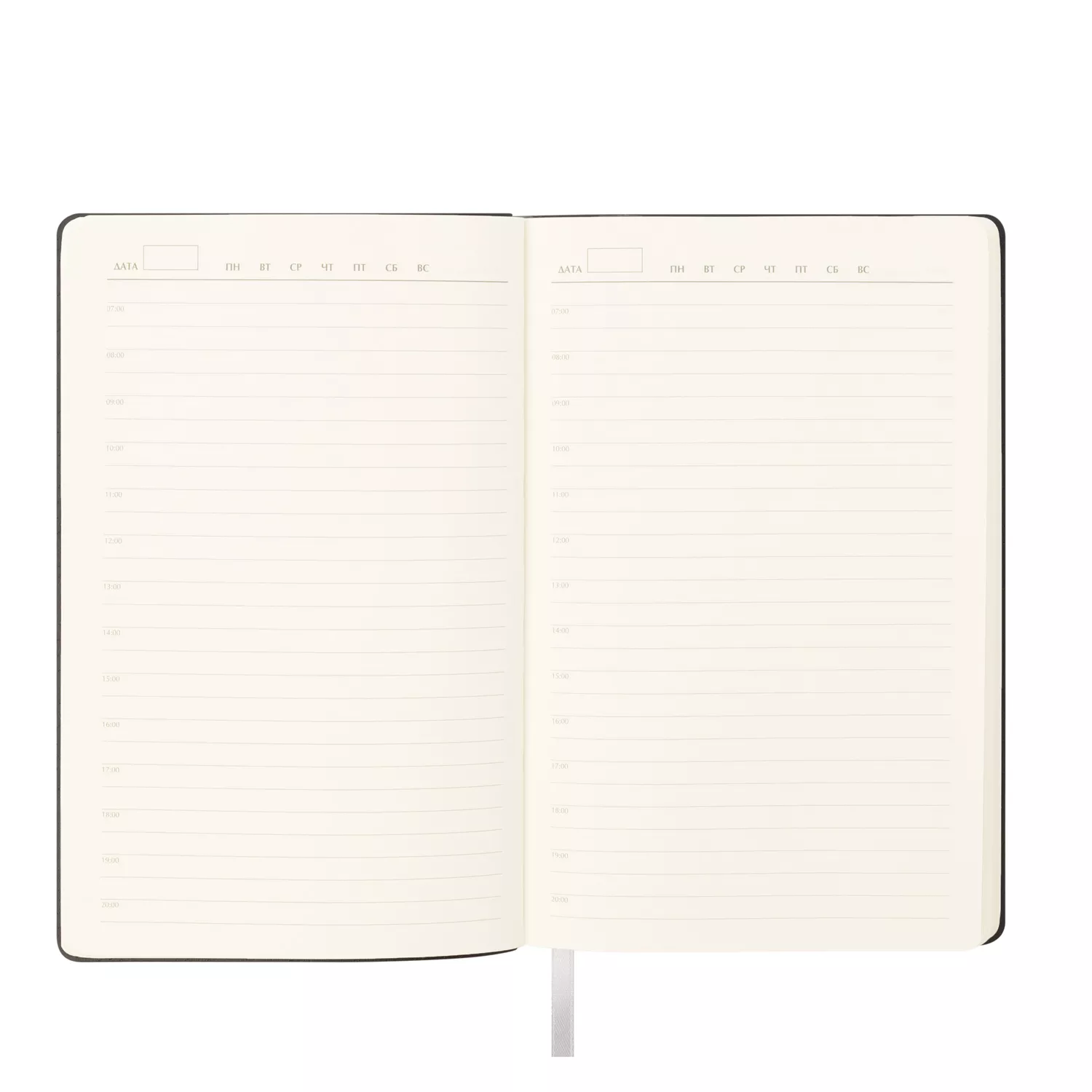 Недатированный ежедневник в гибкой обложке из качественной искусственной кожи со скругленными уголками. Покрытие матовое гладкое, слегка припудренное. Очень приятное на ощупь. Форзац, нахзац и срез кремового цвета. Страницы со скругленными уголками из гладкого шелковистого офсета, кремовые. Одинарное атласное ляссе в цвет обложки. Без пластиковой коробки, без стикеров, без логотипа Portobello на задней обложке.