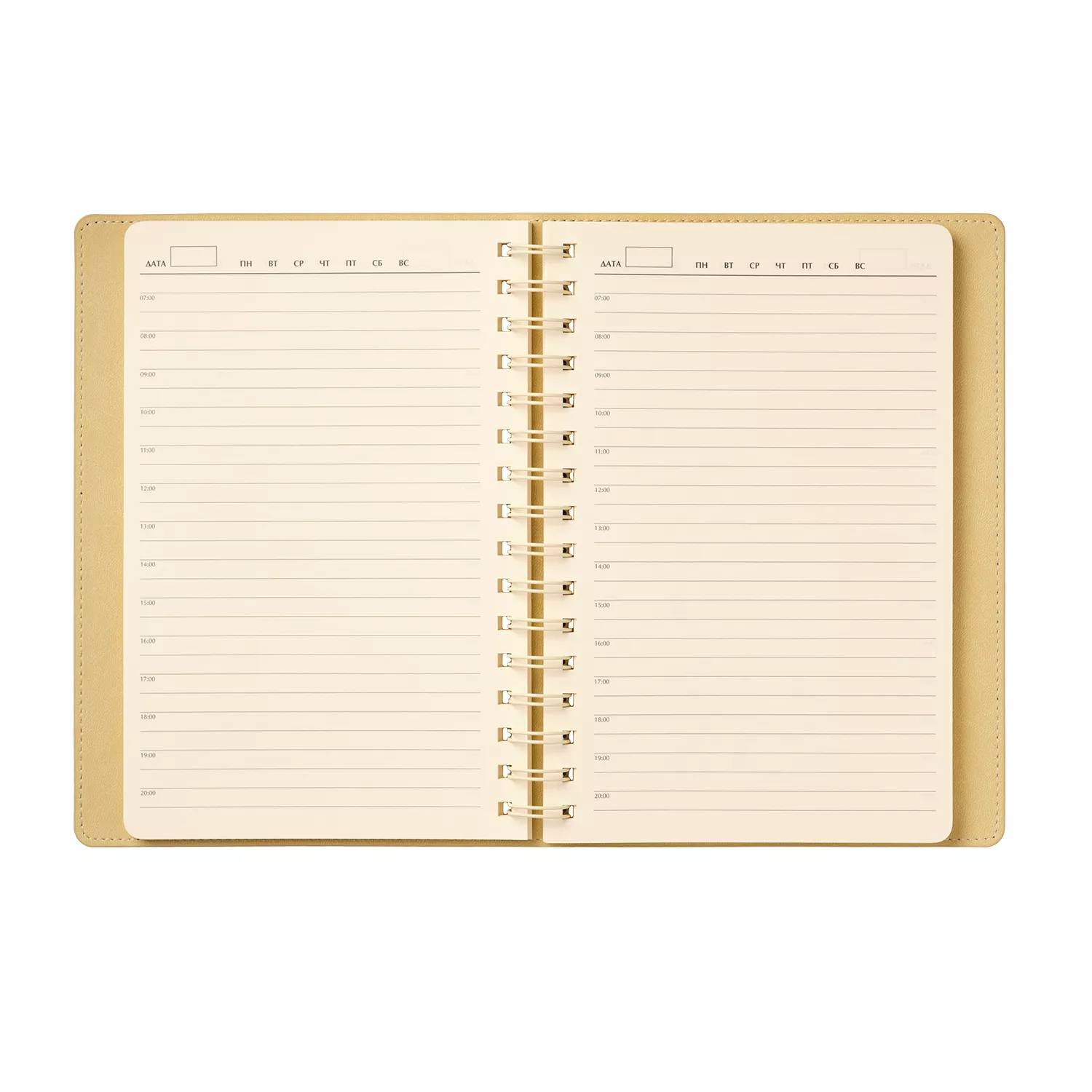 Внутренний блок с кремовыми страницами и срезом гармонично сочетается с нежным оттенком форзаца и нахзаца, повторяющим цвет внутреннего материала обложки. Надежная полускрытая пружина обеспечивает удобство использования и долговечность.