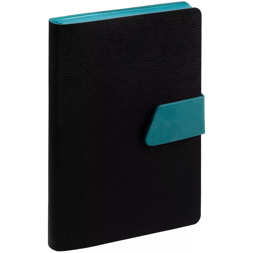 Ежедневник с гибкой обложкой, выполнен из материала La Fite, черный АА и Nubuck, цвет морской волны II, дополнен бирюзовым ляссе и хлястиком на кнопке.