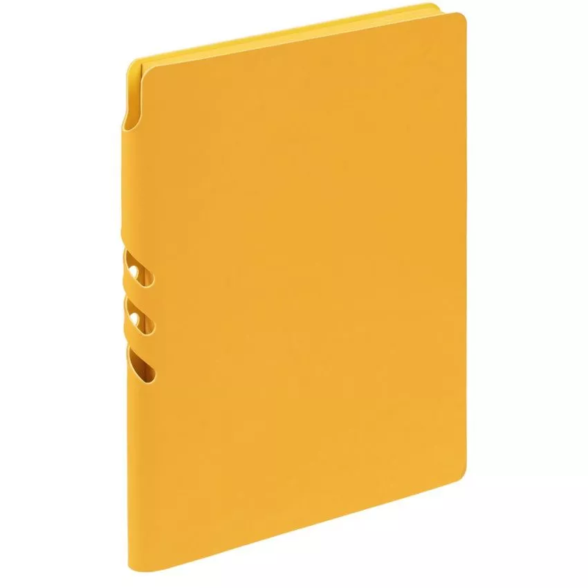 Гибкая обложка выполнена из материала Soft Touch, желтый КК и Latte, желтый КК (внутренняя часть обложки). Внутри корешка — специальное место для крепления ручки размером до 15х1 см.