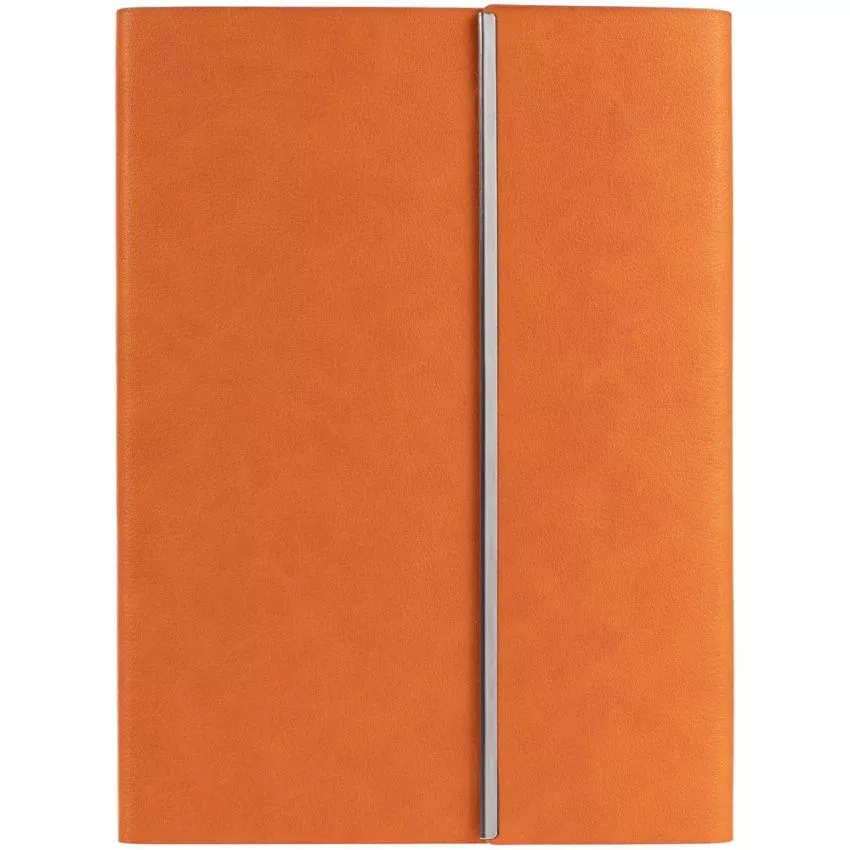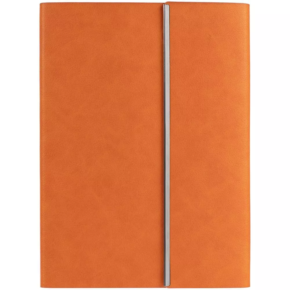 Ежедневник с гибкой обложкой, клапаном на магните и металлической отделкой клапана. Выполнен из материала Petrus, оранжевый ОО, дополнен серым ляссе.
