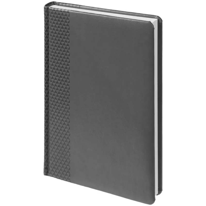 Ежедневник с твердой обложкой, выполнен из материала Waltz, темно-серый EE, дополнен ляссе в цвет материала.