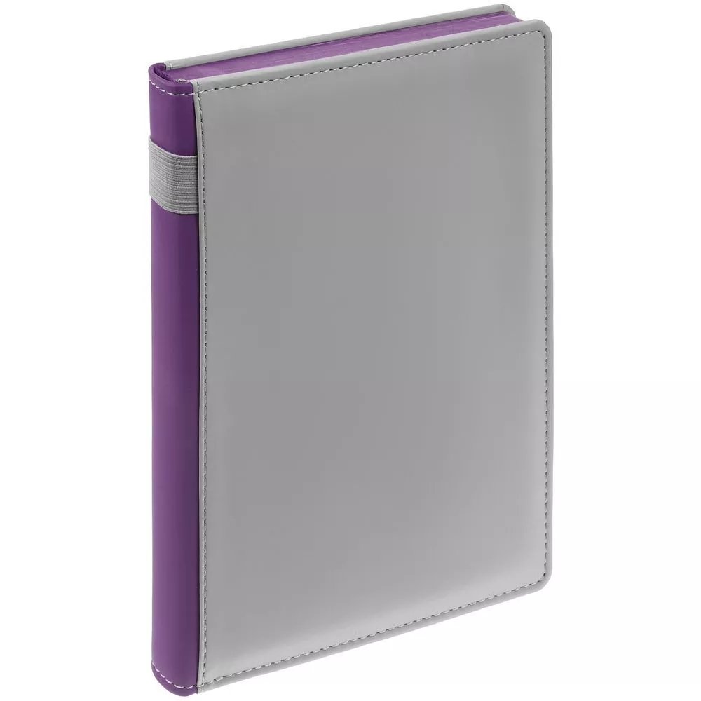 Твердая обложка с поролоном, материал обложки — Soft Touch, серый СС и Soft Touch, фиолетовый UU. На корешке ежедневника находится петля из резинки.