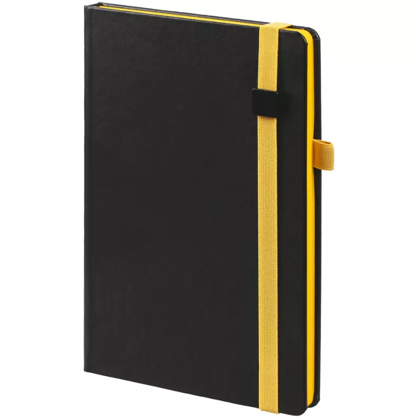 Ежедневник с полутвердой обложкой, выполнен из материала Waltz, черный АА, дополнен желтой резинкой с металлическим шильдом и ляссе.
