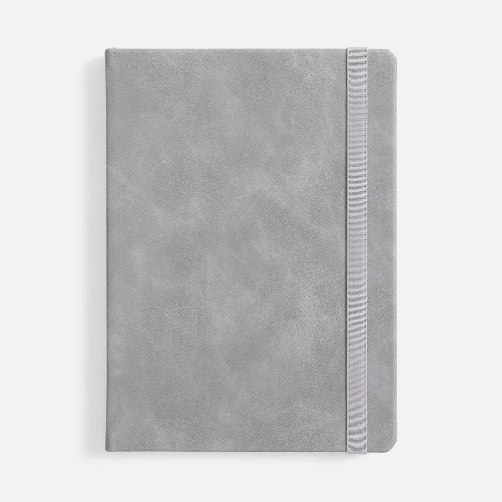 Ежедневник с твердой обложкой, выполнен из материала Nubuck Touch, серый СС, дополнен ляссе темно-серого цвета.