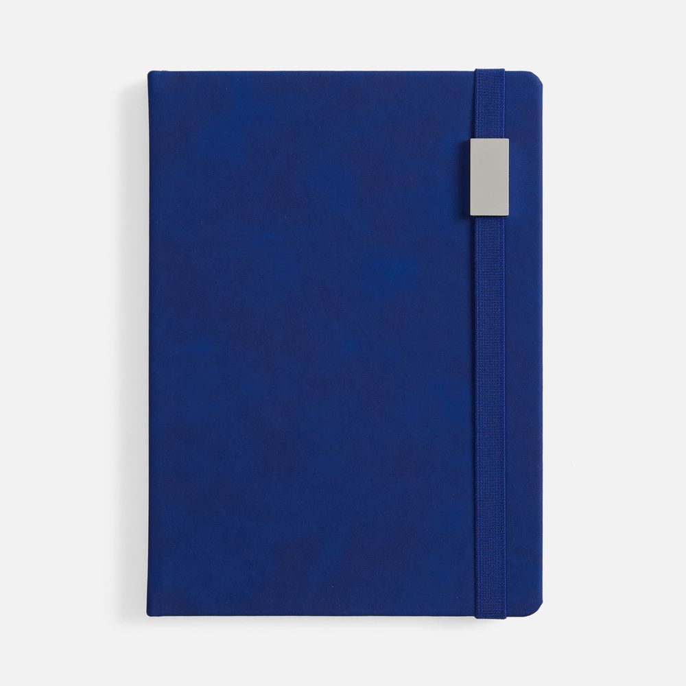 Ежедневник с твердой обложкой, выполнен из материала Nubuck Touch, темно-синий ХХ, дополнен ляссе темно-синего цвета.