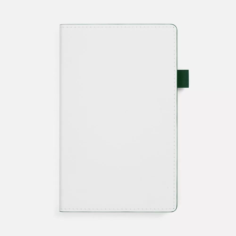 Гибкая обложка, материал обложки — Soft Touch, белый BB и Latte, зеленый FF; материал петли для ручки — Nice Touch, зеленый FF. Срез обложки окрашен в зеленый цвет.
