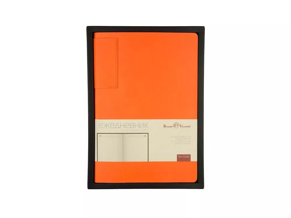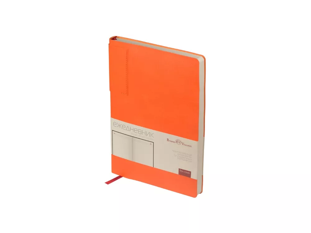 Лаконичная модель в ярком исполнении: гибкая обложка оранжевого цвета с контрастной или в цвет обложки нашивкой. Выполнен из качественной и прочной искусственной кожи, крепление внутреннего блока - книжный переплет, закладка- ляссе. Углы обложки скруглены.