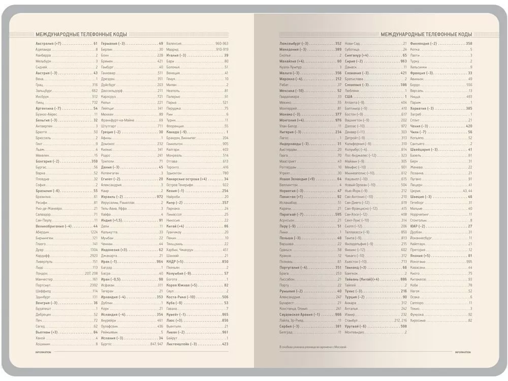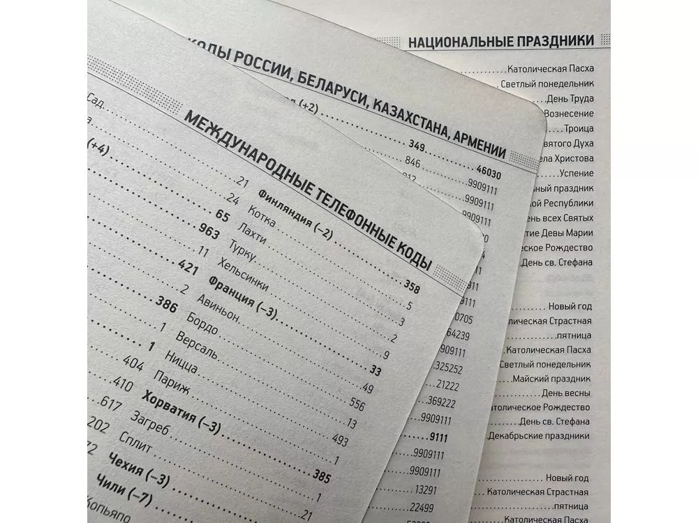 • справочная информация на 19 страницах (аэропорты Европы, штрихкоды, международные телефонные коды, цифровые автомобильные коды, энергетическая и питательная ценность продуктов, национальные и религиозные праздники, единицы измерения, страны мира, размеры одежды, форматы бумаги и др.);