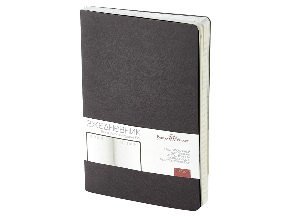 В ежедневнике Megapolis Flex есть полезная справочная информация и телефонная книга, а также страницы для записи идей, мыслей и составления рабочих планов. Для изготовления страниц используется качественный бежевый офсет повышенной плотности (70 г/кв м). Блок не привязан к конкретным датам – они указываются в выделенном поле вверху страницы. Тонированная бумага не дает глазам утомиться даже при длительной работе.