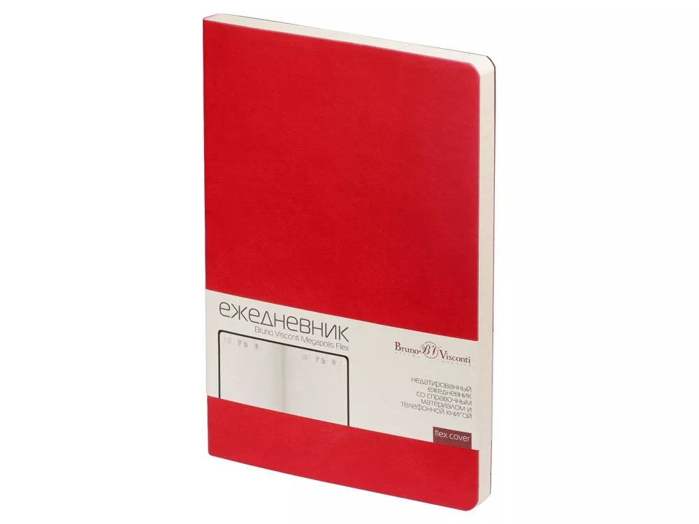 В ежедневнике Megapolis Flex есть полезная справочная информация и телефонная книга, а также страницы для записи идей, мыслей и составления рабочих планов. Для изготовления страниц используется качественный бежевый офсет повышенной плотности (70 г/кв м). Блок не привязан к конкретным датам – они указываются в выделенном поле вверху страницы. Тонированная бумага не дает глазам утомиться даже при длительной работе.
