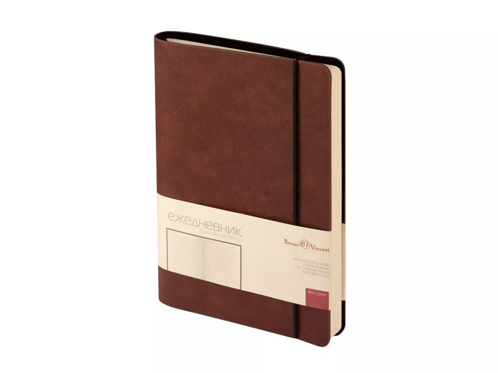 Отличительной особенностью ежедневника является горизонтальная, скрепляющая обложку и блок, тоненькая резинка. Оригинальное решение позволяет раскрывать ежедневник на 180 градусов и вести записи у самого края корешка. Для фиксации второй резинки, не позволяющей ежедневнику раскрываться, предусмотрена выемка на обложке. Обложка тонка, но фактурность придает ей элемент брутальности, а бархатистое нанесение на ее оборотной стороне- благородство и статусность. Картонный карман для визиток, записок, бумаг – функциональная деталь и приятная дополнительная опция. Бумажный блок изготовлен из бумаги бежевого цвета, плотностью 70 г/кв.м и содержит 272 страницы, 23 из которых справочная информация.