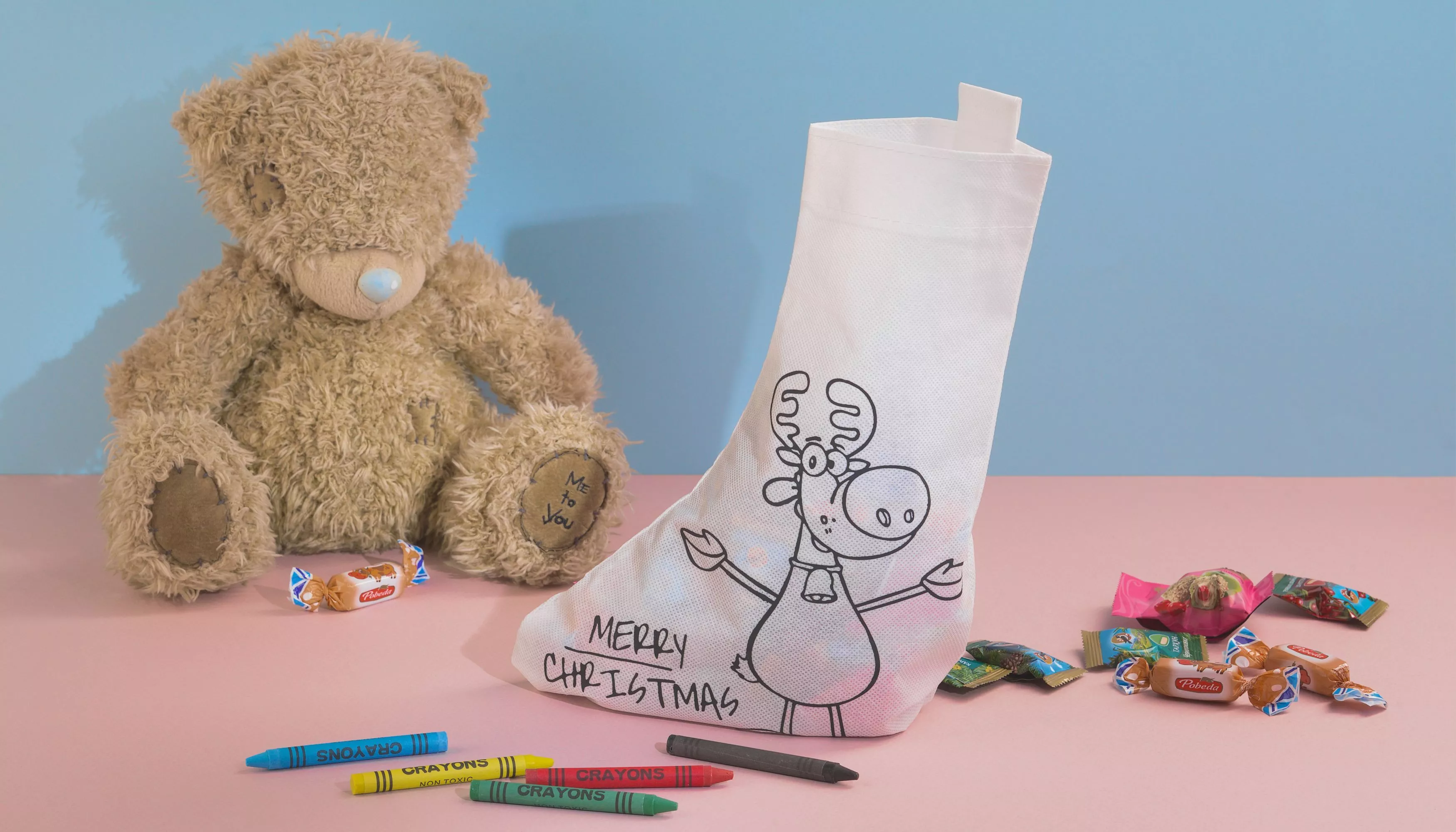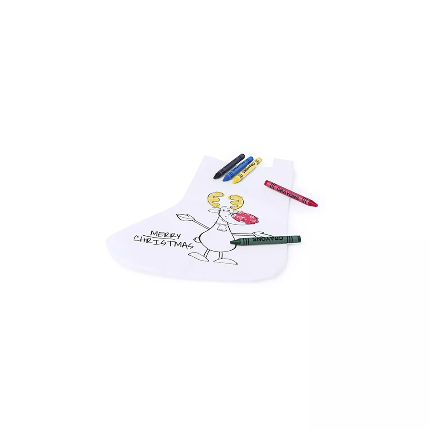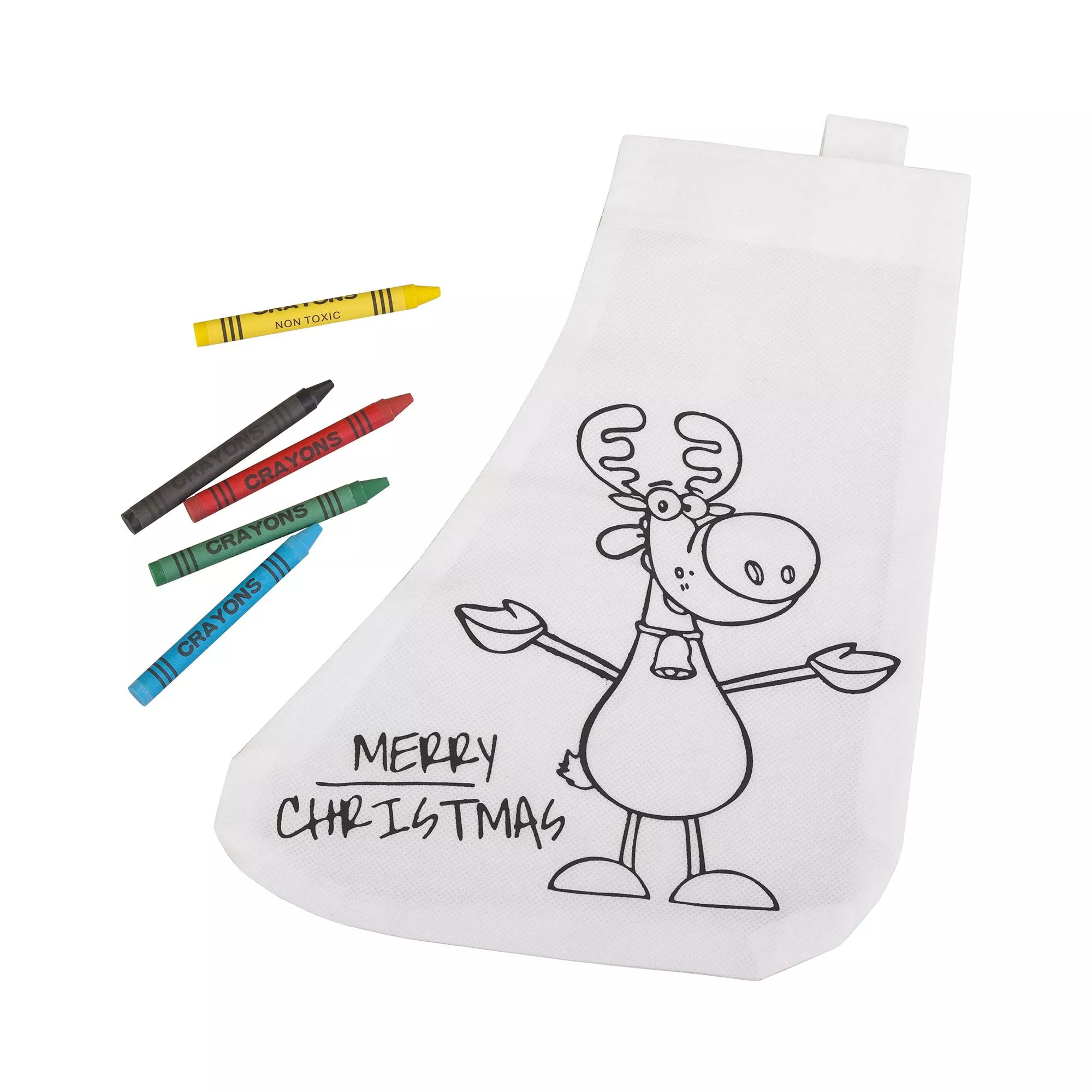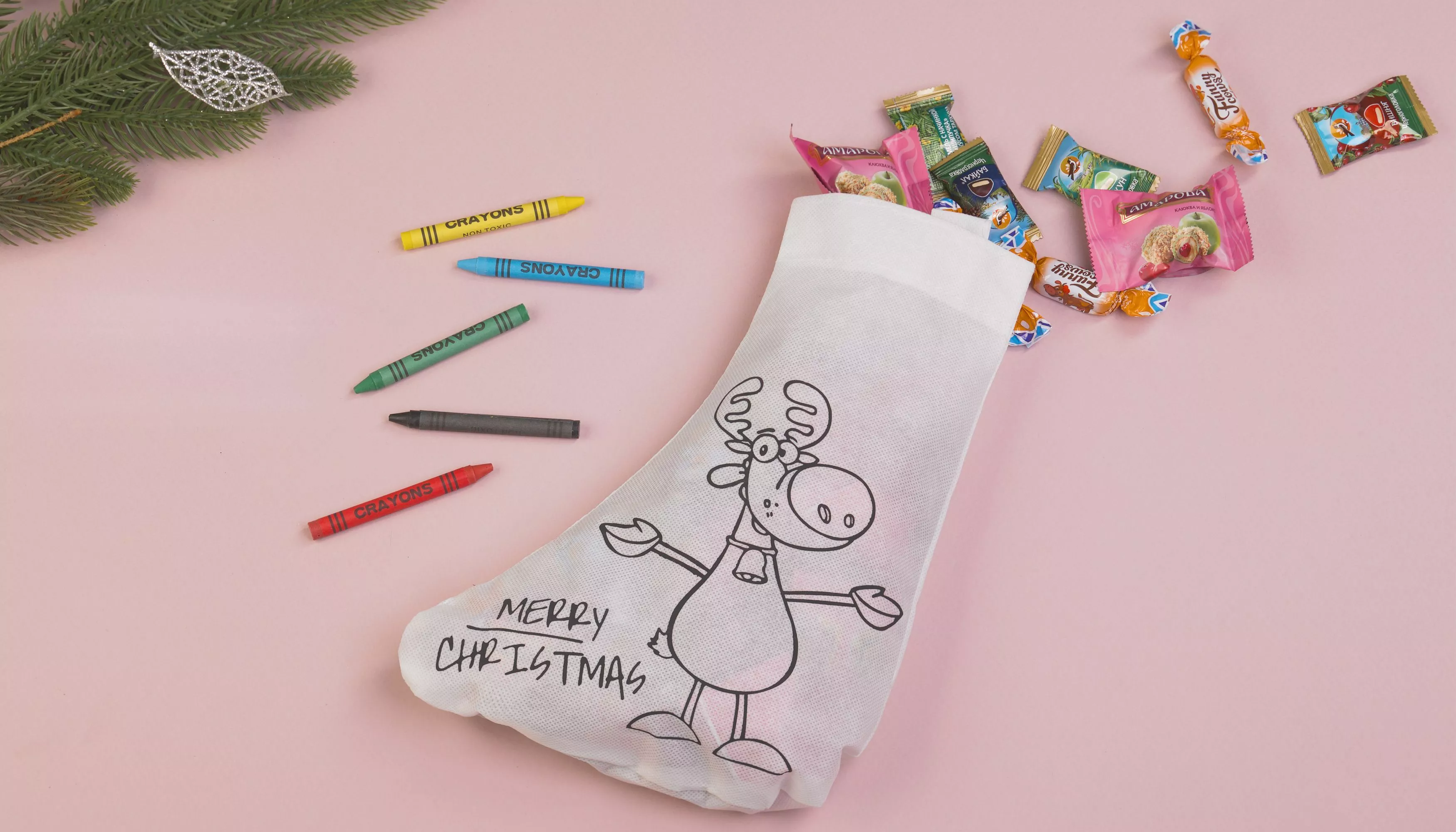 Оригинальный мешок с новогодним рисунком и восковыми мелками в наборе. Его можно подарить как отдельный подарок, или как подарочный мешочек, например под сладости.