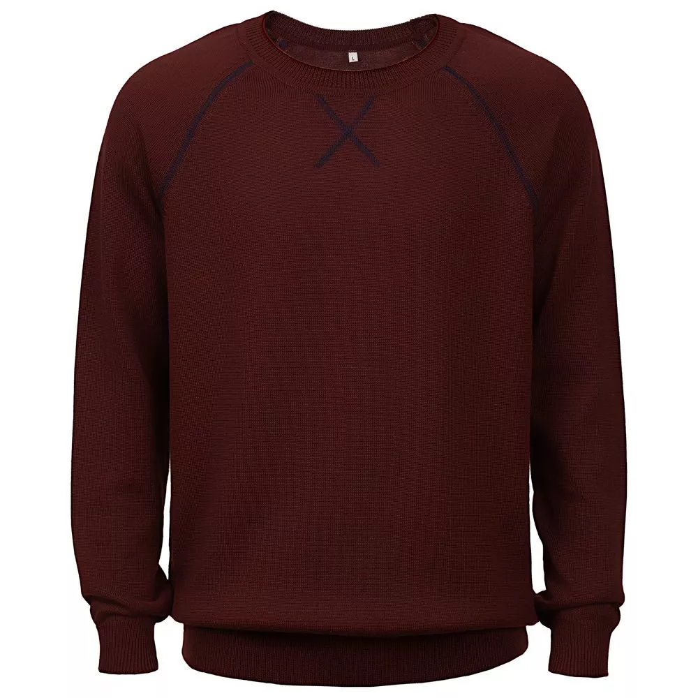 Джемпер чулочной вязки с круглым воротом и контрастной строчкой.