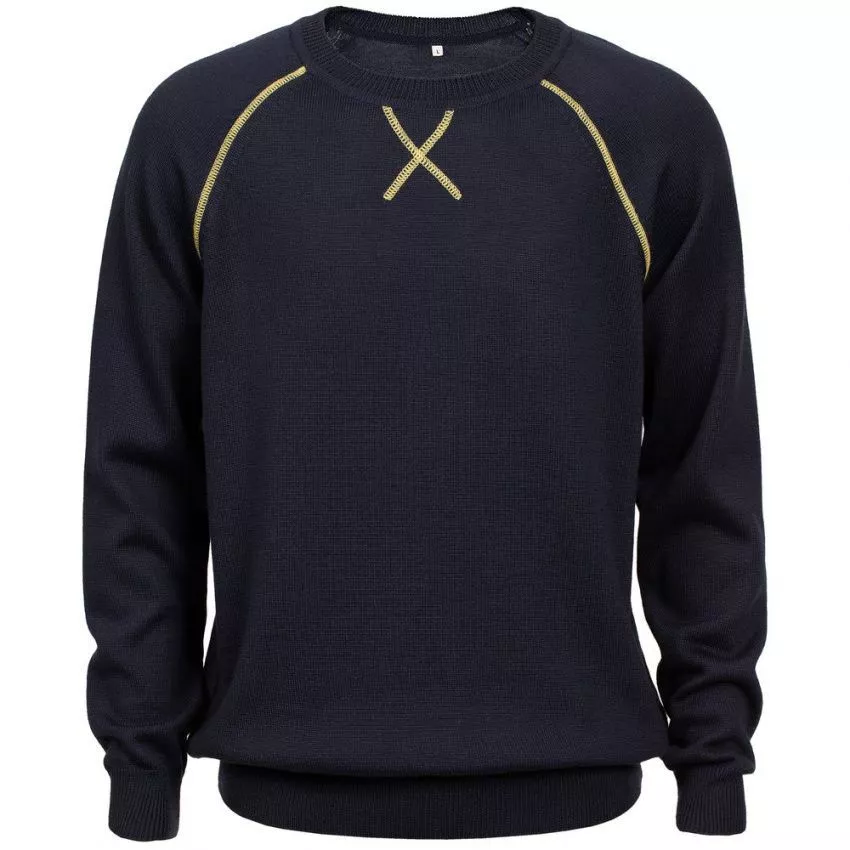 Джемпер чулочной вязки с круглым воротом и контрастной строчкой.