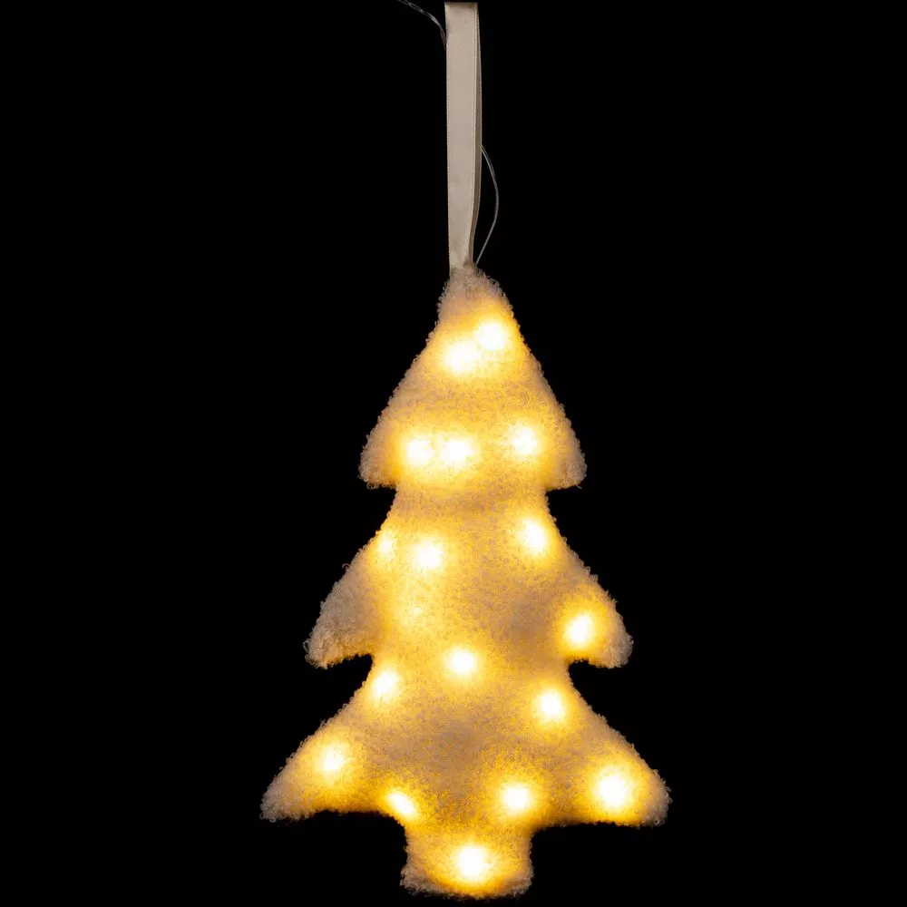 Внутри мягкой елочки находится миниатюрная гирлянда с теплым светом. Работает от 2 батареек типа CR2032 (входят в комплект).
