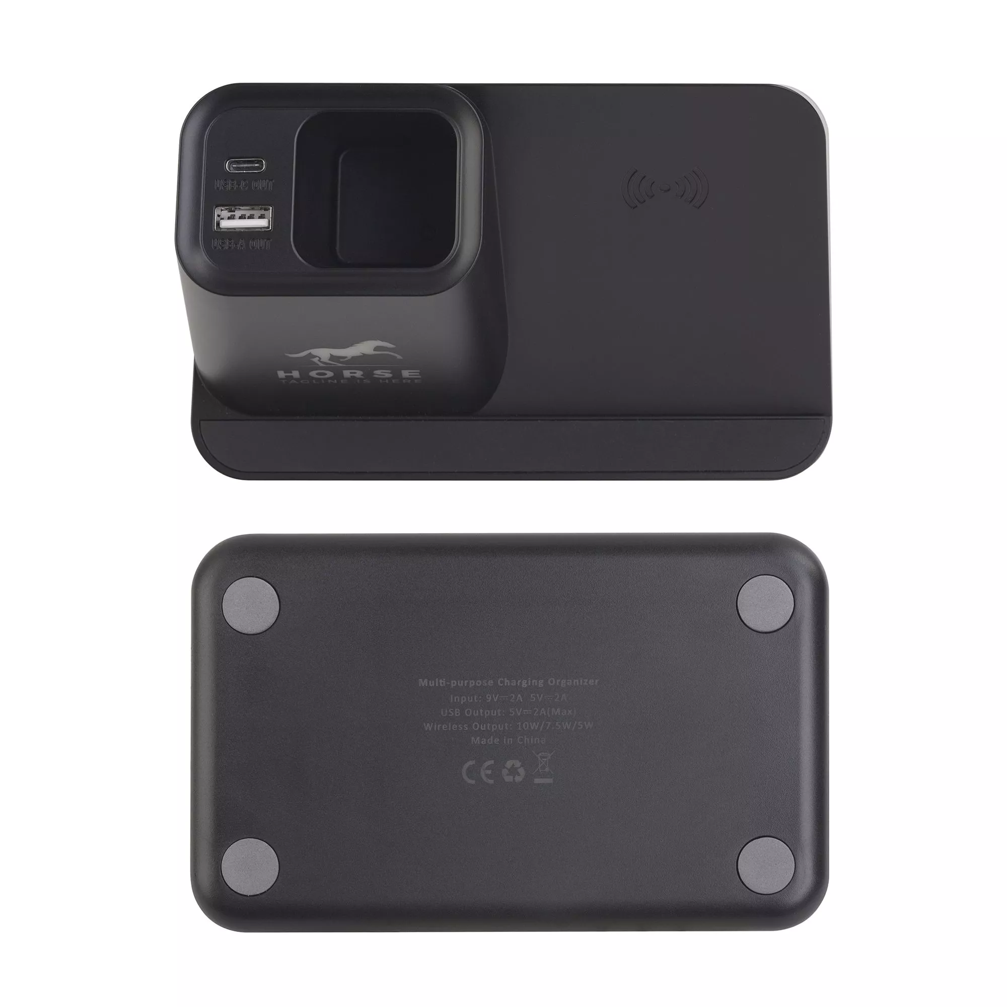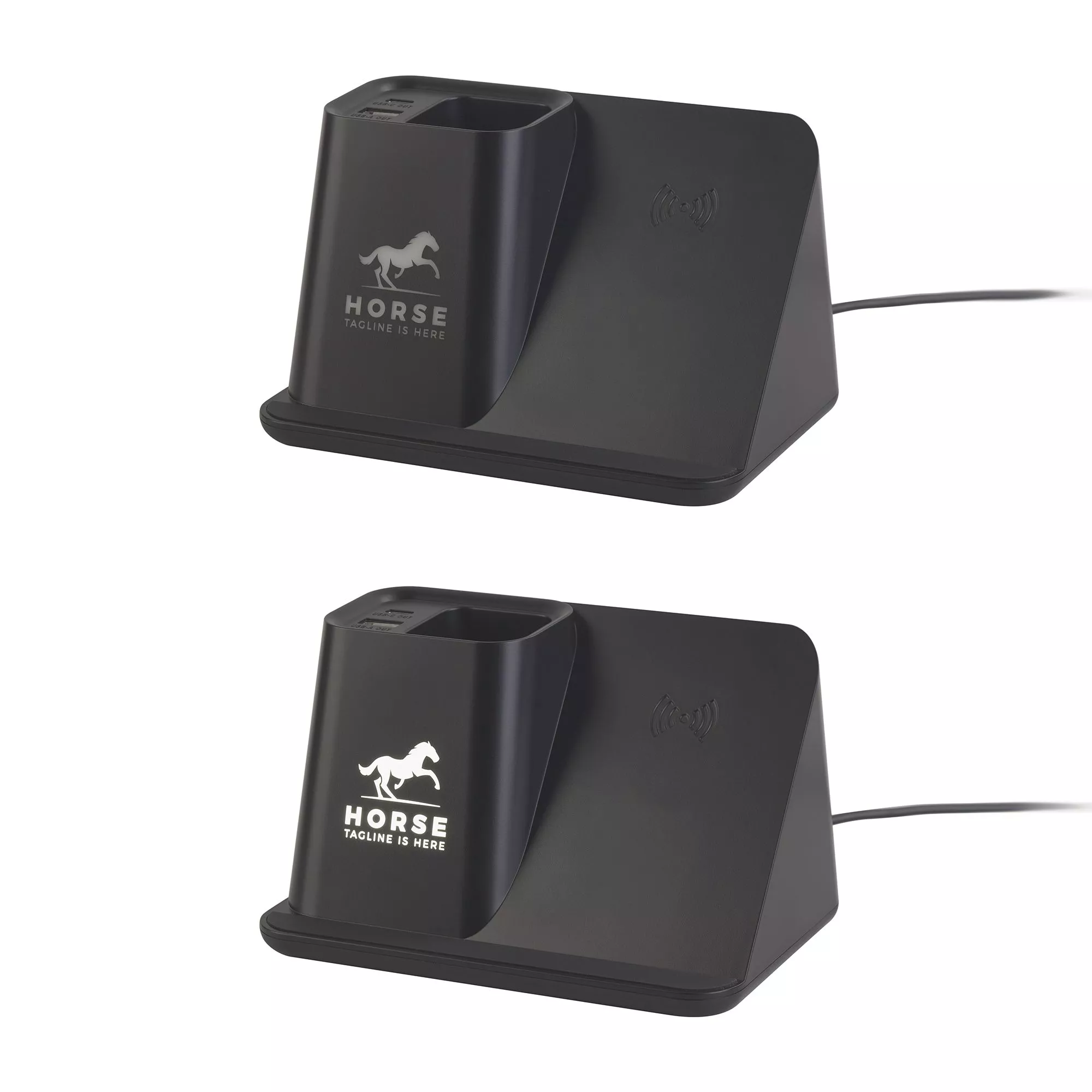 Многофункциональный гаджет с возможностью яркой персонализации – эффектной подсветкой логотипа. Кабель длиной 150 см. позволит подключить и разместить карандашницу в любом удобном месте Вашего рабочего стола. Комплект из персональных вентилятора и лампы дополнен актуальной, повышенной мощности (10W) функцией беспроводной зарядки. А для зарядки смартфона стандартным проводным способом можно использовать разъёмы USB или Type-C, находящиеся в карандашнице.