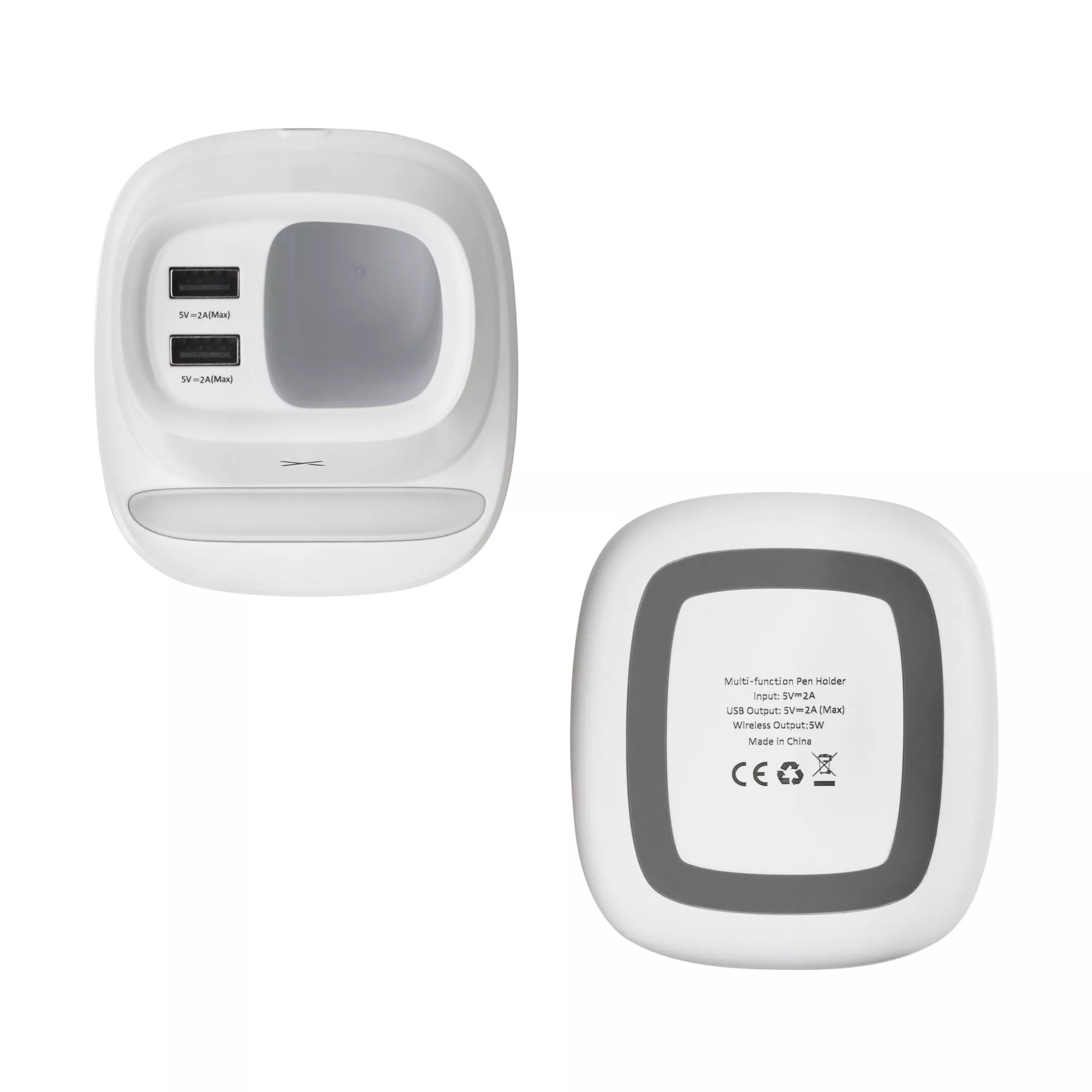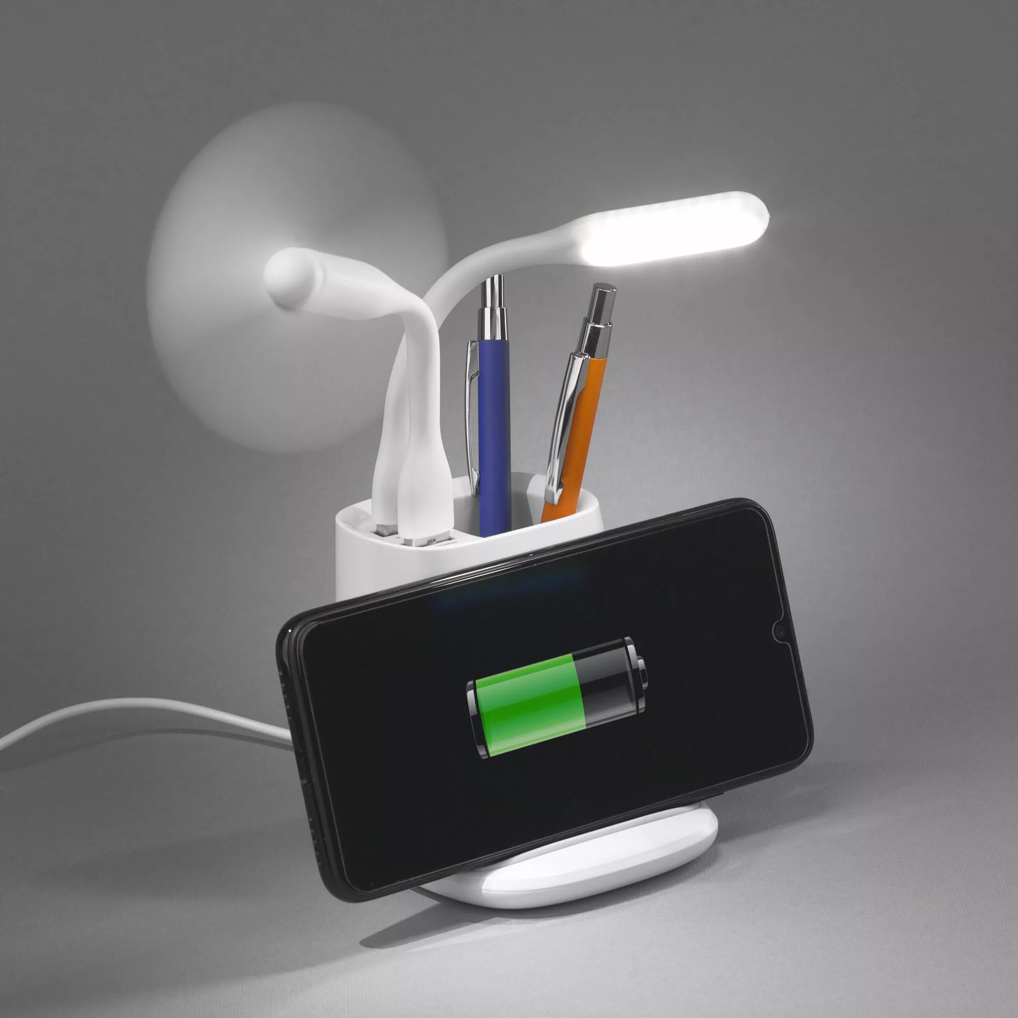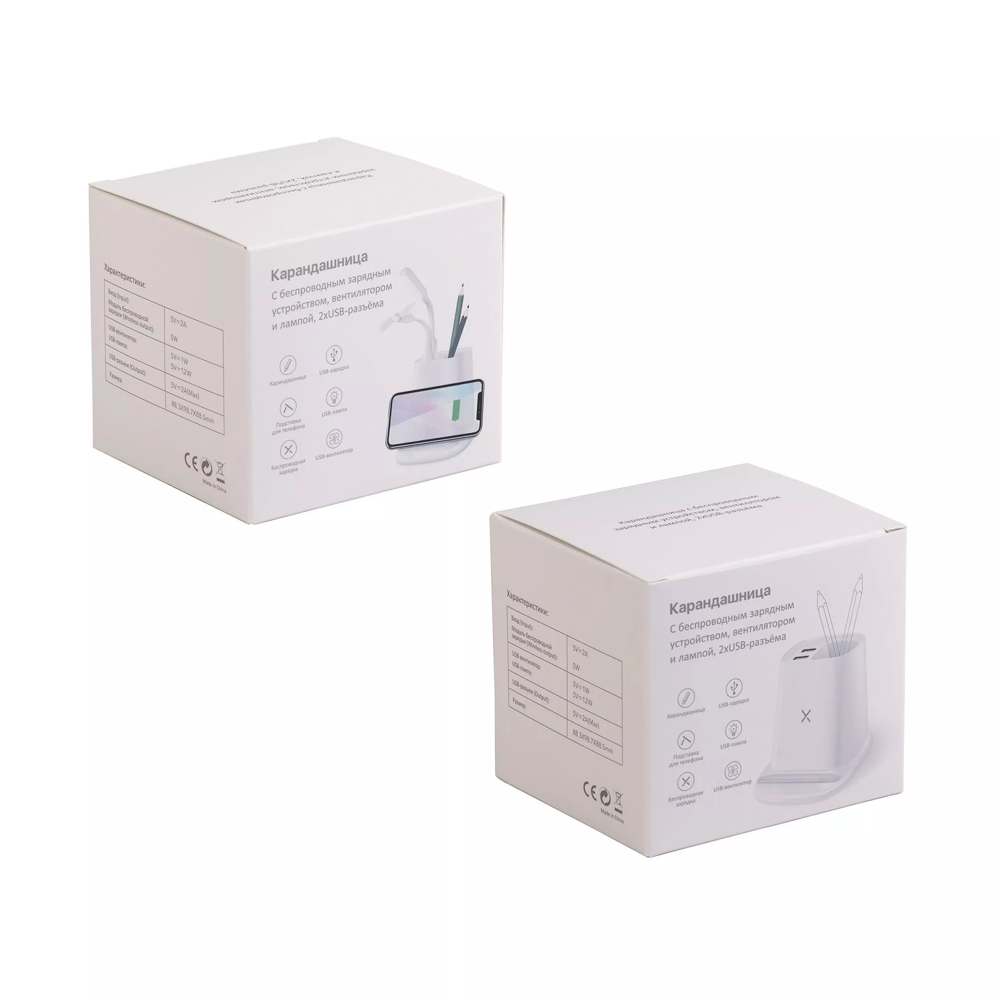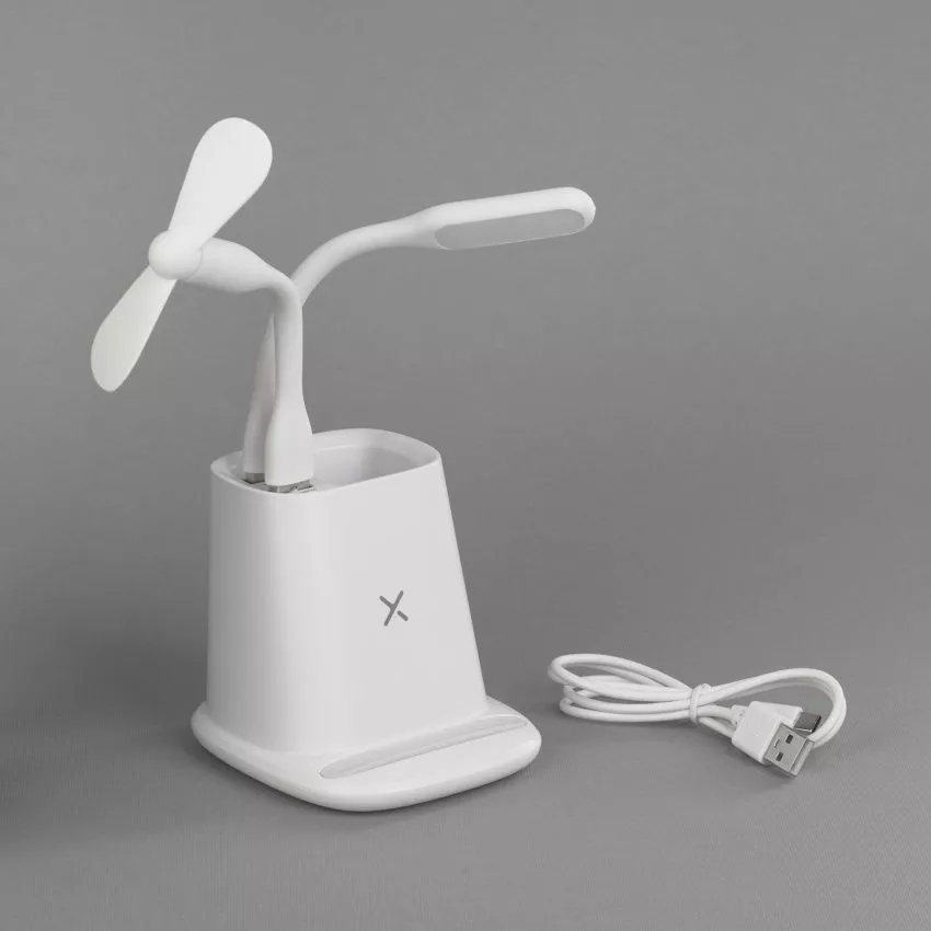 Карандашница подключается к USB-разъёму (ноутбука/компьютера) кабелем длиной 1 м. 2 выхода USB, предназначенные для вентилятора и лампы, можно также использовать для зарядки телефонов проводным способом - таким образом можно заряжать одновременно 3 гаджета.