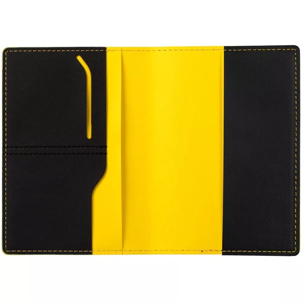 Обложка выполнена из материала Soft Touch Pearl, черный АА и срез обложки окрашен в цвет внутреннего материала Latte, желтый КК.