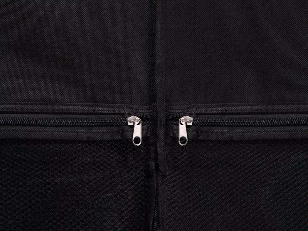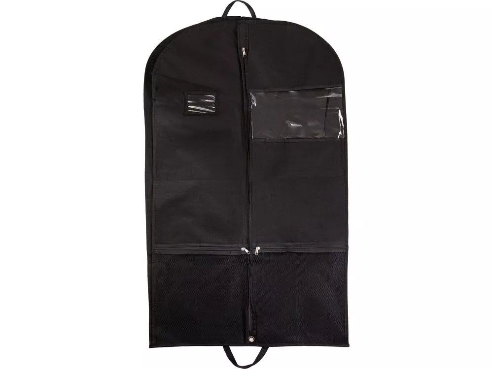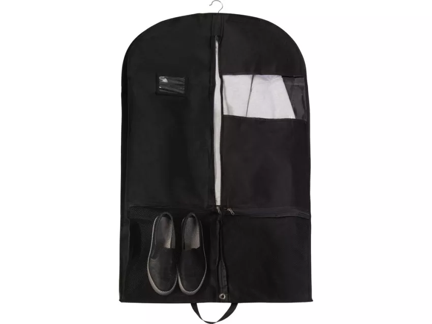 Прозрачное окошко позволяет узнать, что находится внутри, не расстегивая чехол, а кармашек для карточки — снабдить портплед указаниями или комментарием, касающихся одежды. Нижняя часть портпледа снабжена двумя карманами на молнии для обуви, не сообщающимися с основным отделением.